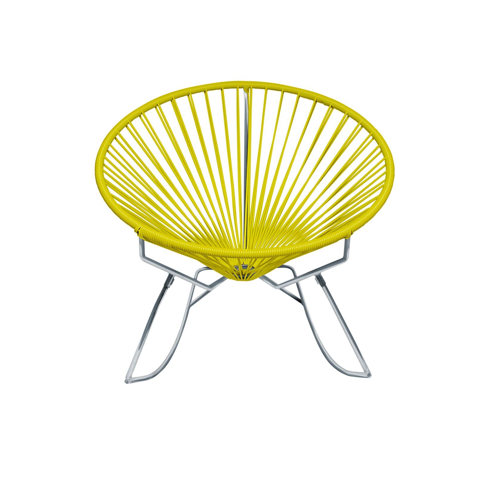 Combining bold colors and a retro cues in a modern design, the Innit Rocker brings subtle sophistication to indoor and outdoor living spaces. In a similar way to the Innit Chair, this rocker chair simplifies the silhouette of the famous Acapulco design to provide a more restrained yet eye-catching seating solution for your home. With a focus on both style and comfort, the chair is a great choice to relax and enhance the look of a decor at the same time. The weatherproof vinyl cord seat offers a cool and breathable surface, even in extreme temperatures. Equally durable, the steel frame boasts a powder-coated finish that keeps the base looking like new, rain or shine. The white and black frame options are perfect for both indoor and outdoor use, while the copper and chrome finishes suit indoor use only. Handmade in LA and Toronto.