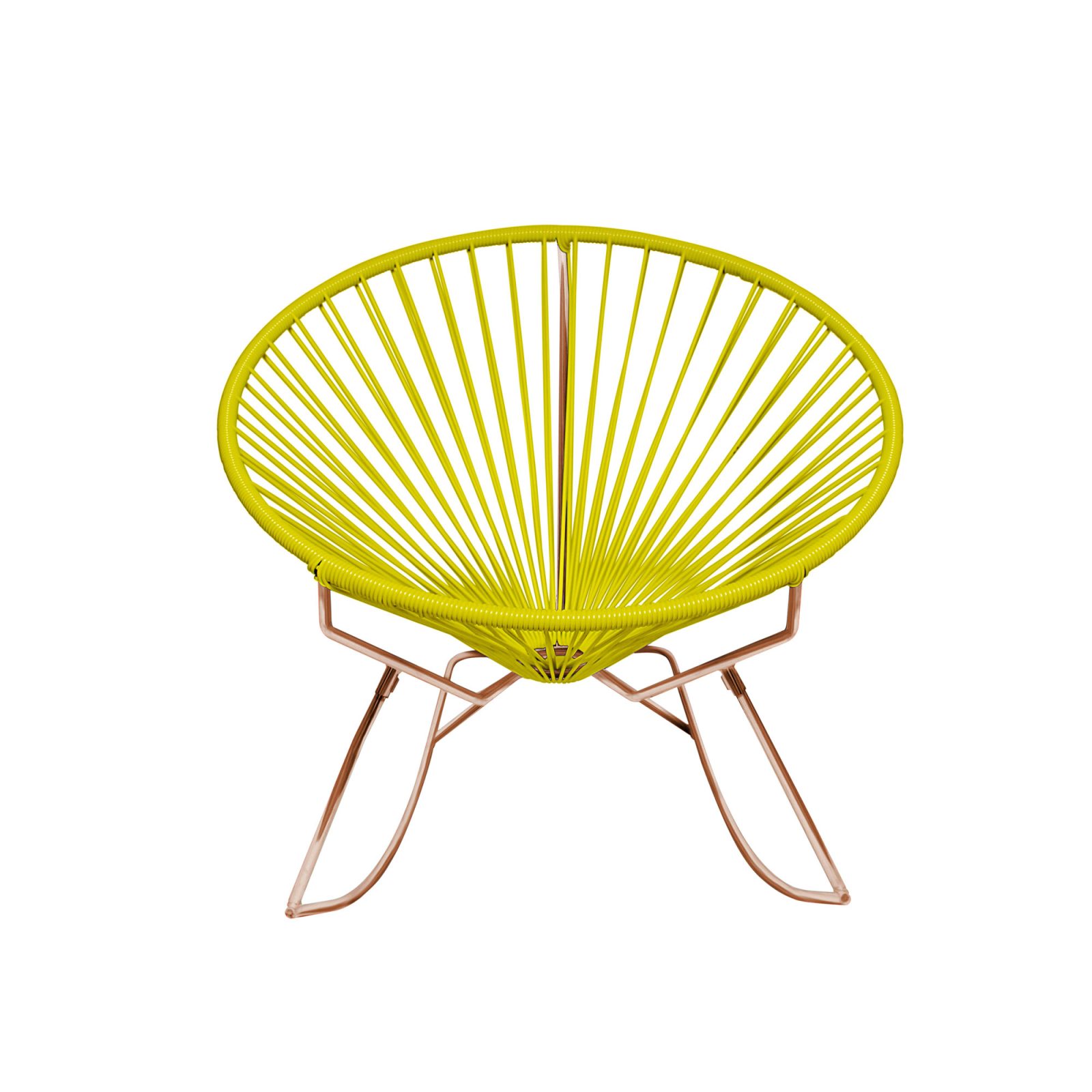 Combining bold colors and a retro cues in a modern design, the Innit Rocker brings subtle sophistication to indoor and outdoor living spaces. In a similar way to the Innit Chair, this rocker chair simplifies the silhouette of the famous Acapulco design to provide a more restrained yet eye-catching seating solution for your home. With a focus on both style and comfort, the chair is a great choice to relax and enhance the look of a decor at the same time. The weatherproof vinyl cord seat offers a cool and breathable surface, even in extreme temperatures. Equally durable, the steel frame boasts a powder-coated finish that keeps the base looking like new, rain or shine. The white and black frame options are perfect for both indoor and outdoor use, while the copper and chrome finishes suit indoor use only. Handmade in LA and Toronto.