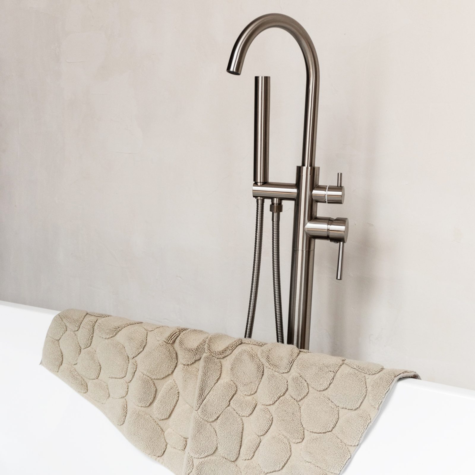 Imagine getting out of the shower or bubble bath and stepping onto the soft, tactile and warm Ishikoro Pebble Bath Mat. Designed and made in Japan, this product draws inspiration from stone river beds where pebbles have been smoothed by the movement of water to a perfect polish. The mat was created in a collaboration between designer Masaru Suzuki and manufacturer Yoshii Towel, bringing Japanese design and beautifully craftsmanship into your home. Made from 100% cotton with a padded texture, the Ishikoro Pebble Bath Mat has a cushioned feel and a smooth surface that absorbs moisture but also dries quickly. This version has a dark gray hue, adding contrast to a lighter palette in a bathroom or complementing a similar color scheme.