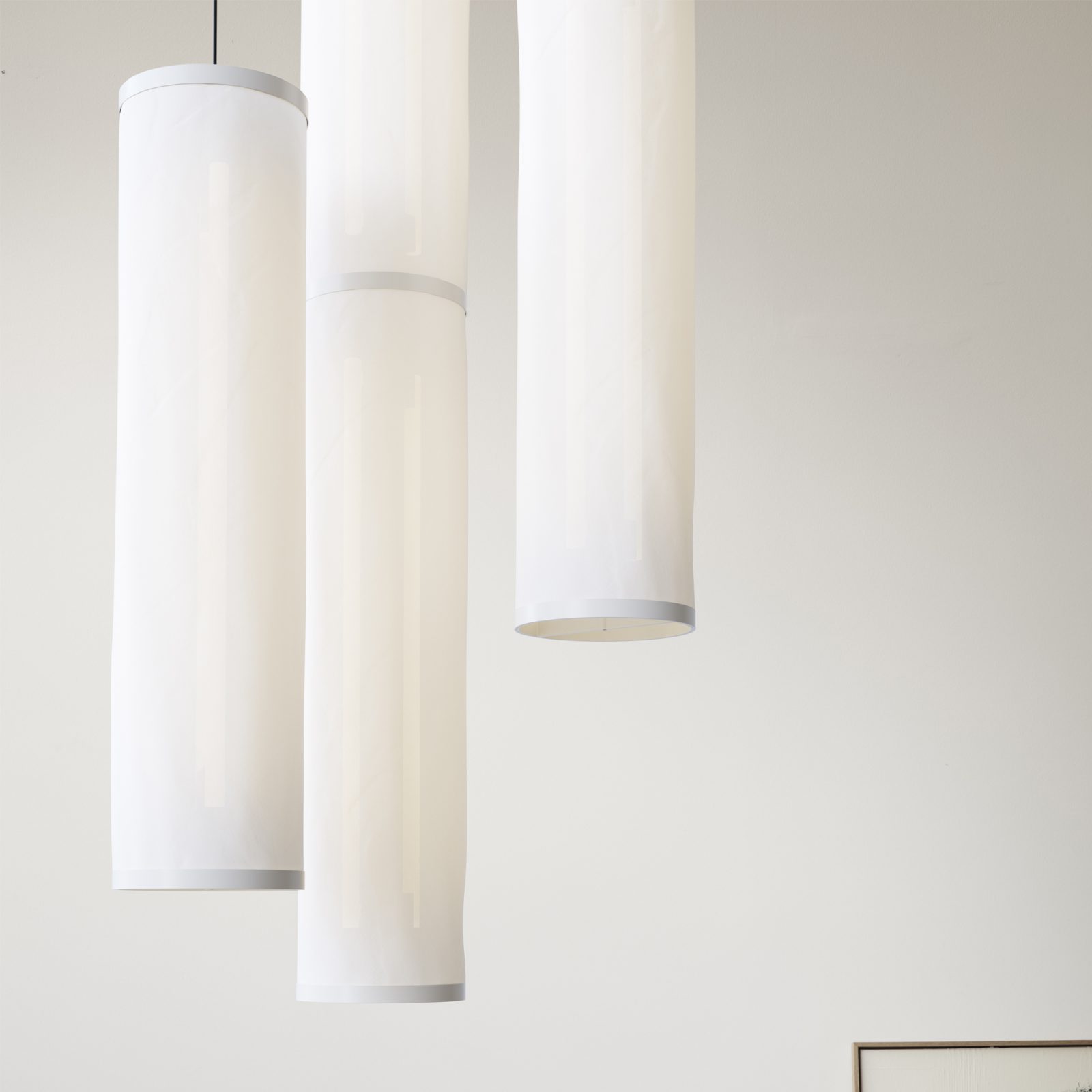 Crafted in Italy, the ISOL Pendant lamp exemplifies precision engineering and technological innovation. It features the patented Snowsound Fiber textile, endowing the lamp with exceptional sound absorption and acoustic properties. This fabric is not only fully recyclable but also boasts a Greenguard Gold certification, highlighting its role in emitting low levels of pollutants and enhancing indoor air quality. The ISOL lamp is both an artistic statement and a source of illumination, versatile in its application across both private and public spaces. It introduces acoustic benefits into environments in an aesthetically pleasing manner. Used singly, it commands attention with its understated presence, creating a sense of seclusion. When used in groups, its unique appeal is amplified. The interconnected rings increase both its illumination and sound-absorbing capabilities. This design creates a continuous harmony of color and texture, encircling the die-cast aluminum rings. The lamp’s internal components are discreetly hidden, allowing it to blend seamlessly into its surroundings and transform into a functional and life-enhancing design element.