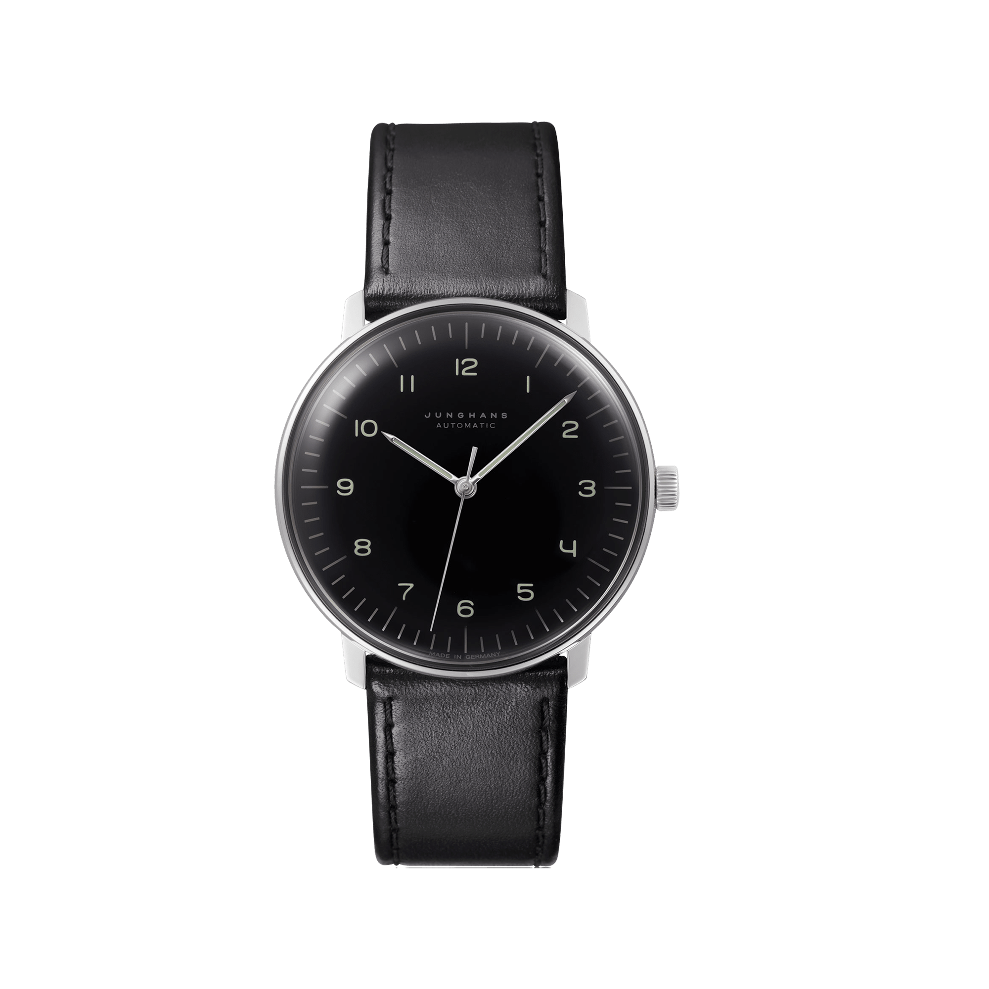 Sleek minimalism in a premium timepiece, the Junghans Max Bill Automatic watch is as versatile as it is refined. The watch honors the legacy of designer, painter, sculptor, and architect Max Bill. Blending purity of form with intensity, the timepiece features a clean dial with a bold black color. Simple markers and thin hands boast a silver gray hue to ensure optimal clarity during the day, with luminous coating on the hands providing superior readability at night and in the dark. The stainless steel case comes with a curved plexiglass cover that boasts an anti-scratch treatment. This black Junghans Max Bill Automatic watch features a self-winding J800.1 movement and a black leather strap.