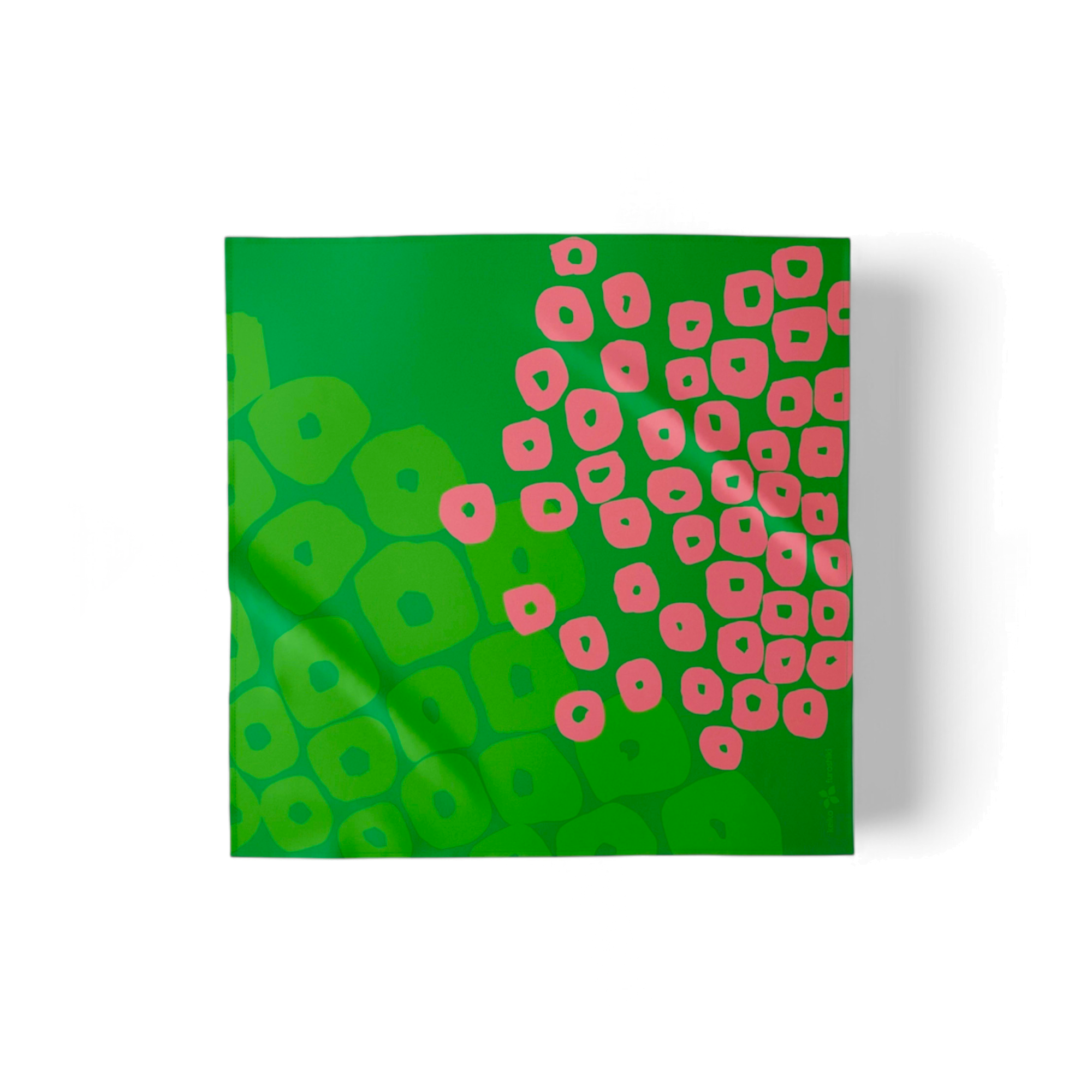 Organic shapes, soft motion. This wrap draws from the Kanoko shibori technique and reinvents it with soft green tones and scattered pink marks that feel like petals or footprints in the grass. With a playful, natural rhythm, it works equally well as a wrap, scarf, or carry cloth.