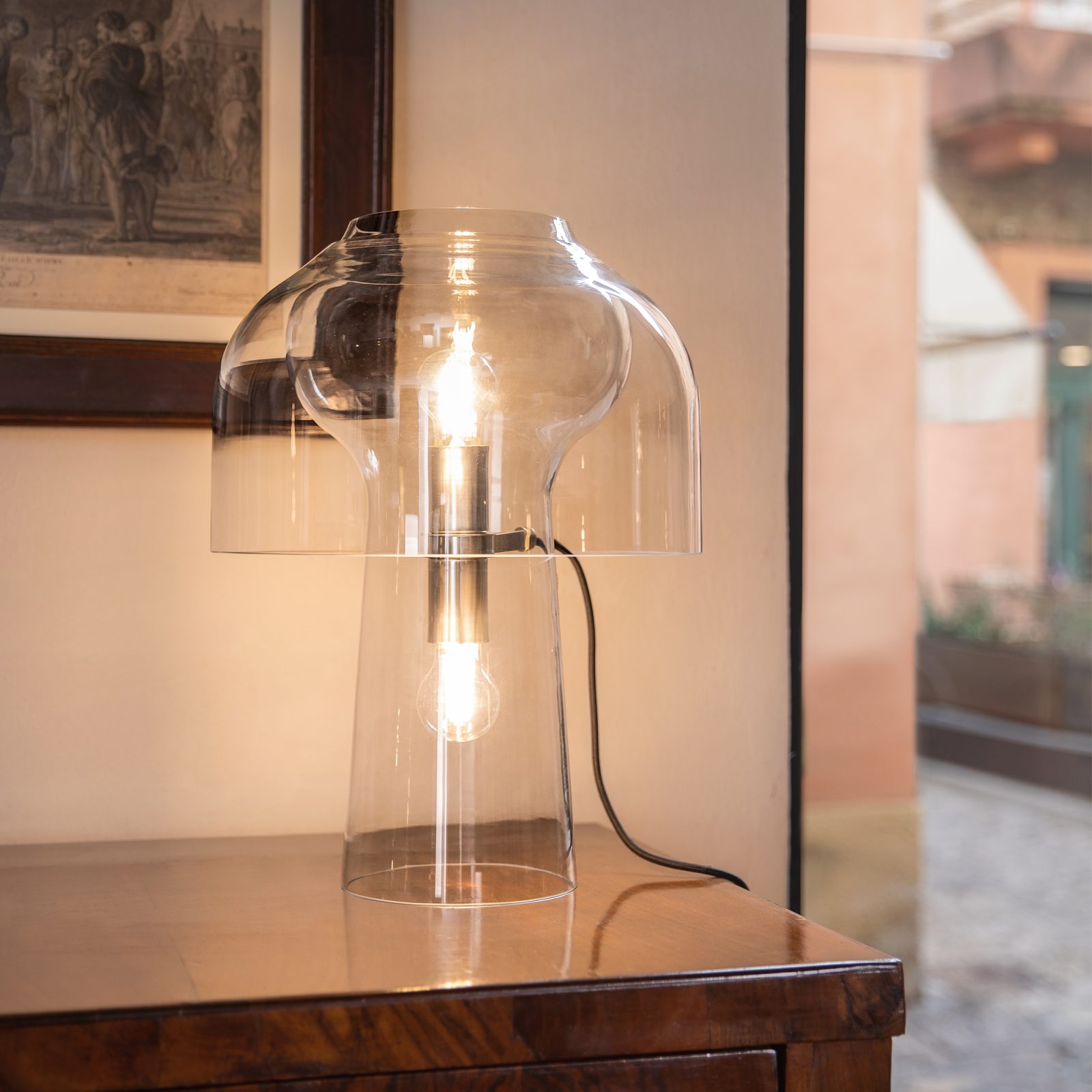 The Lilly table lamp, conceived by Giorgio Silla, offers three distinct versions, each encapsulating its unique aesthetic essence. Embracing sinuous elegance, this lamp presents itself in varying personalities: a transparent voile crafted from blown glass, revealing the dual light fitting within both base and shade; a unified frosted white glass rendition blurring the boundaries between base and shade; and a captivating two-tone composition, featuring smoked glass for the body and transparent glass for the diffuser. Paying homage to Lilly Reich, the visionary German architect and exhibition designer of the Bauhaus era, the lamp’s name commemorates her groundbreaking work, including the renowned “Glass Room” exhibition she co-created with Mies van der Rohe. This avant-garde showcase celebrated the transformative potential of glass, showcasing its innovative use in bold, original forms.