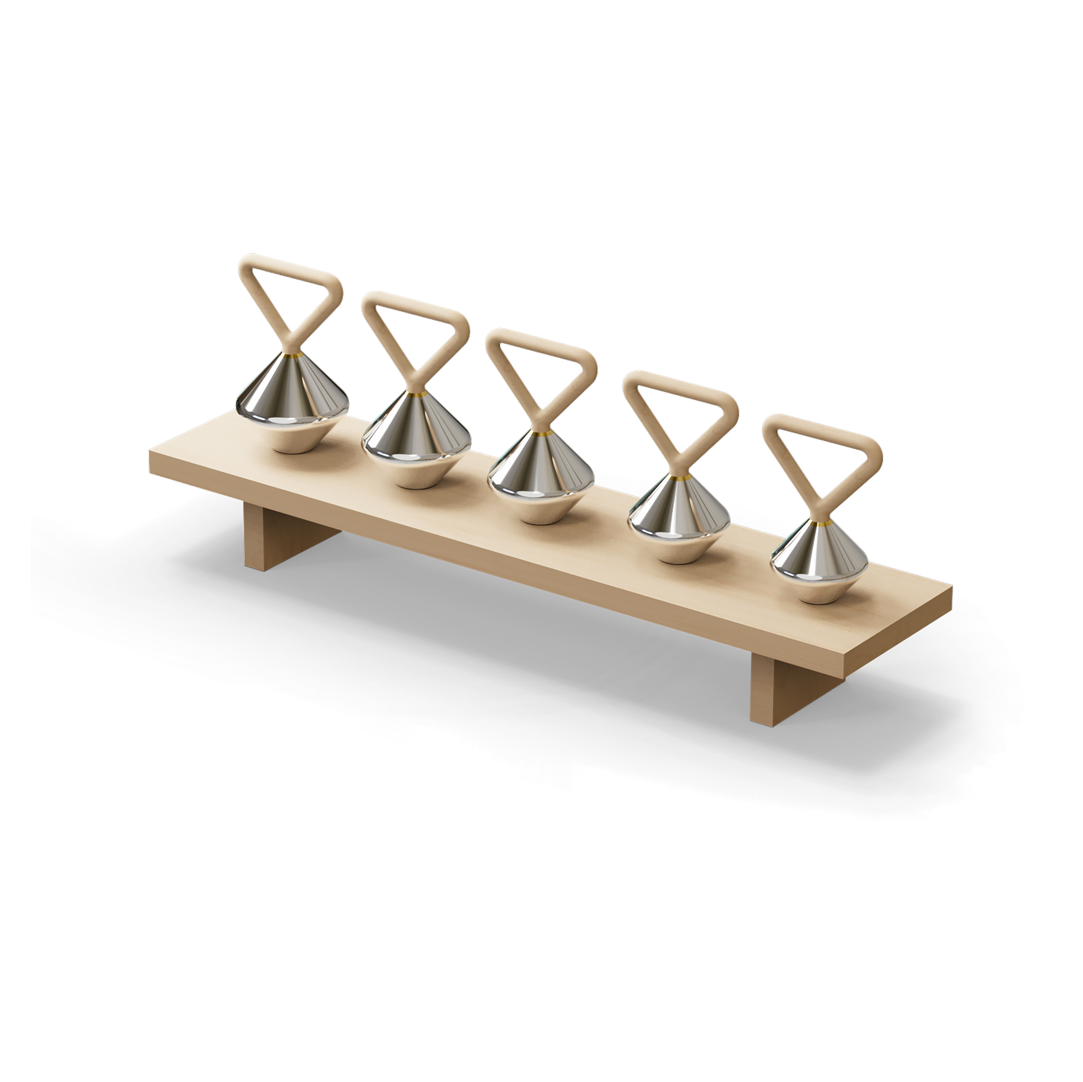 Between sessions, the bells rest on a furniture-grade platform—solid wood planks that match the handles and turn raw ironwork into something you’re happy to keep in the living room. Felt pads under every saddle silence re-racking and protect the finish.
