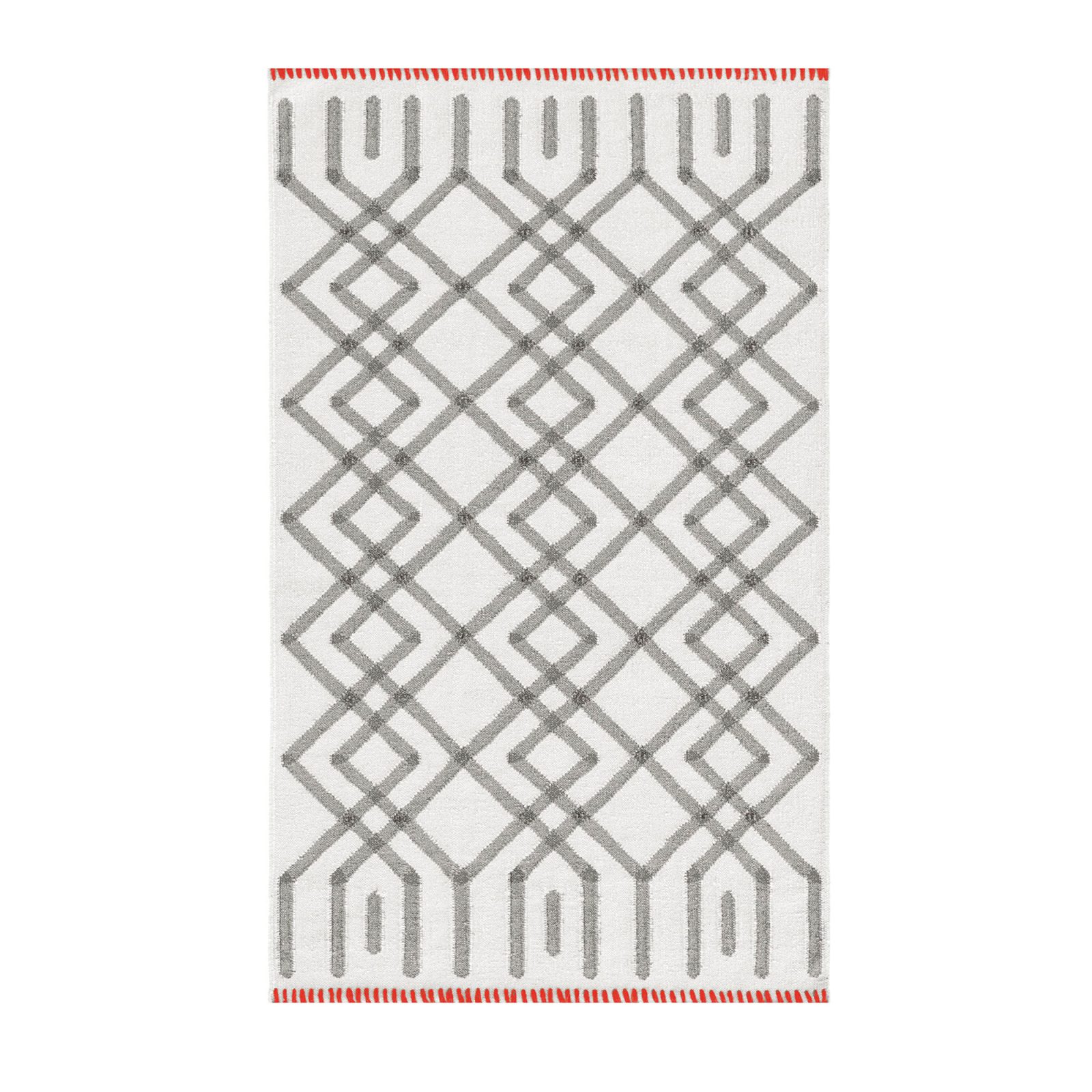 The Kilim Duna Rug draws from the quiet geometry of desert landscapes, where shifting sands create ever-changing patterns. Designed by Odosdesign, its repeating diamond motif is woven by hand using traditional kilim techniques, resulting in a flat, lightweight structure. Soft, neutral wool tones keep the design subtle, while a coral-hued stitch detail along two edges adds a touch of unexpected contrast. Versatile and reversible, this rug works effortlessly in a variety of spaces and is available in three sizes, including a runner and bedside format.