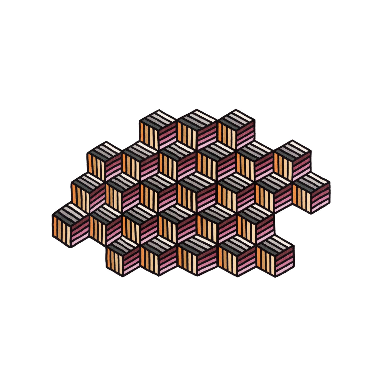 The Parquet Hexagon Rug by GAN Rugs reinterprets traditional kilim weaving with a modern, three-dimensional effect. Designed by Front, this flat-woven wool rug takes inspiration from classic parquet flooring patterns, creating a dynamic interplay of shape and depth. The precise geometric layout and carefully selected color gradients give the illusion of shifting planes, adding movement to any space.