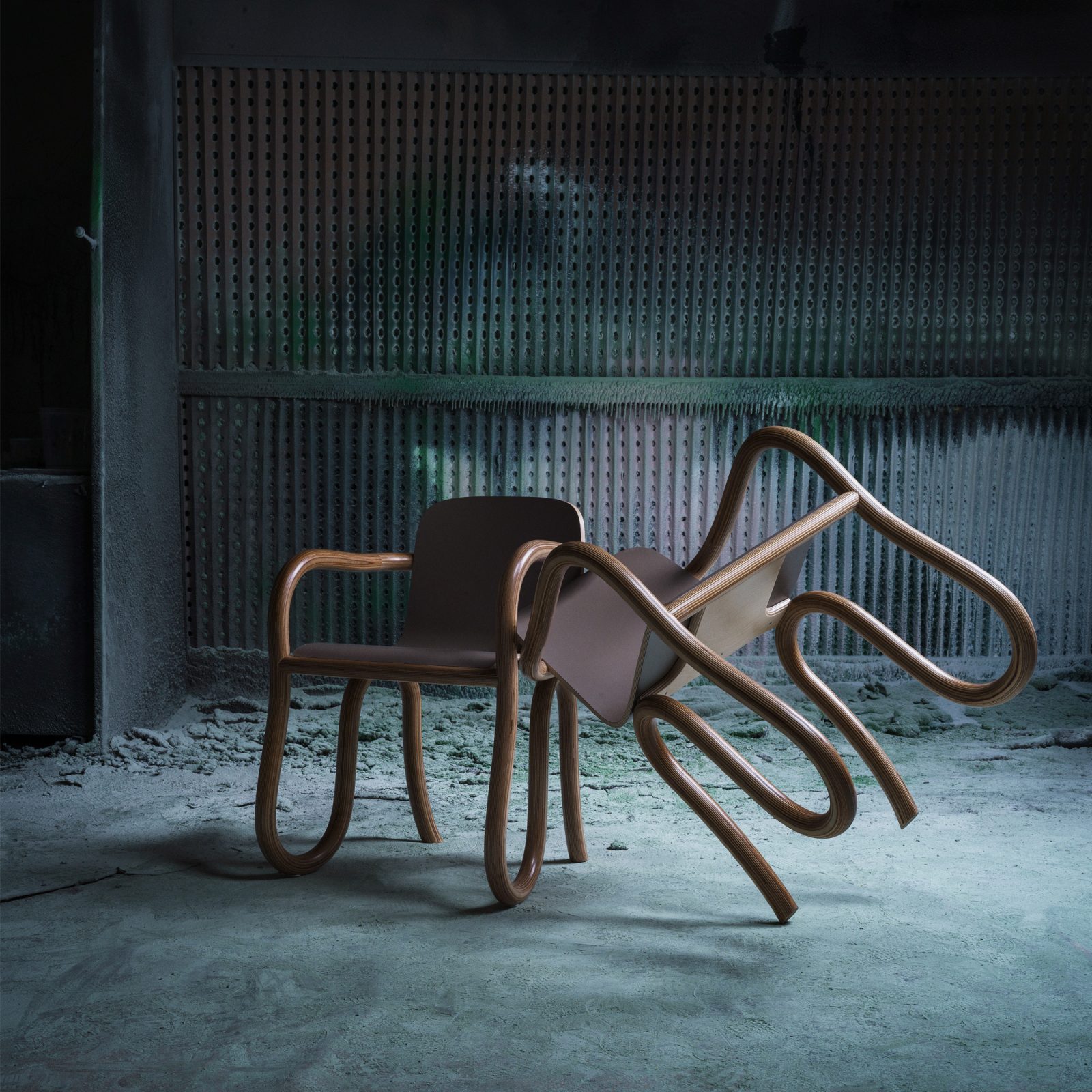 “Kolho is a series of tables and chairs formed of right angles and serpentine forms. It is inspired by Apollo landing and a small town called Kolho in Finland. The serpent represents temptation and chaos which supports the flat plane of reason. The space between Reason and Chaos is that of PLAY. This is the space where our human animal truly shows its greatest self.” — Matthew Day Jackson, artist (Hauser & Wirth)