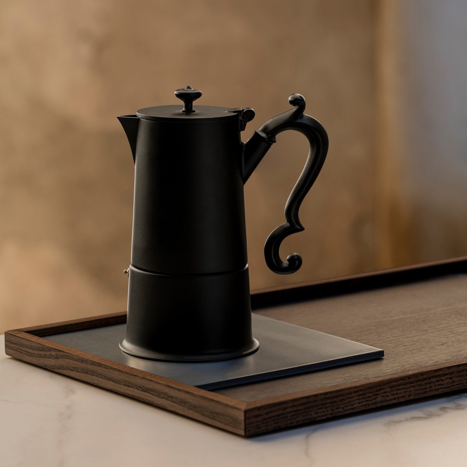 Crafted from aluminum with a deep matte black finish, the moka pot features an ergonomic Bakelite handle with sculptural curves and a matching knob on the lid for easy opening. Its distinctive profile is more than decorative—every detail is considered for performance and visual impact. The wide circular base includes a double bottom for optimal heat distribution.