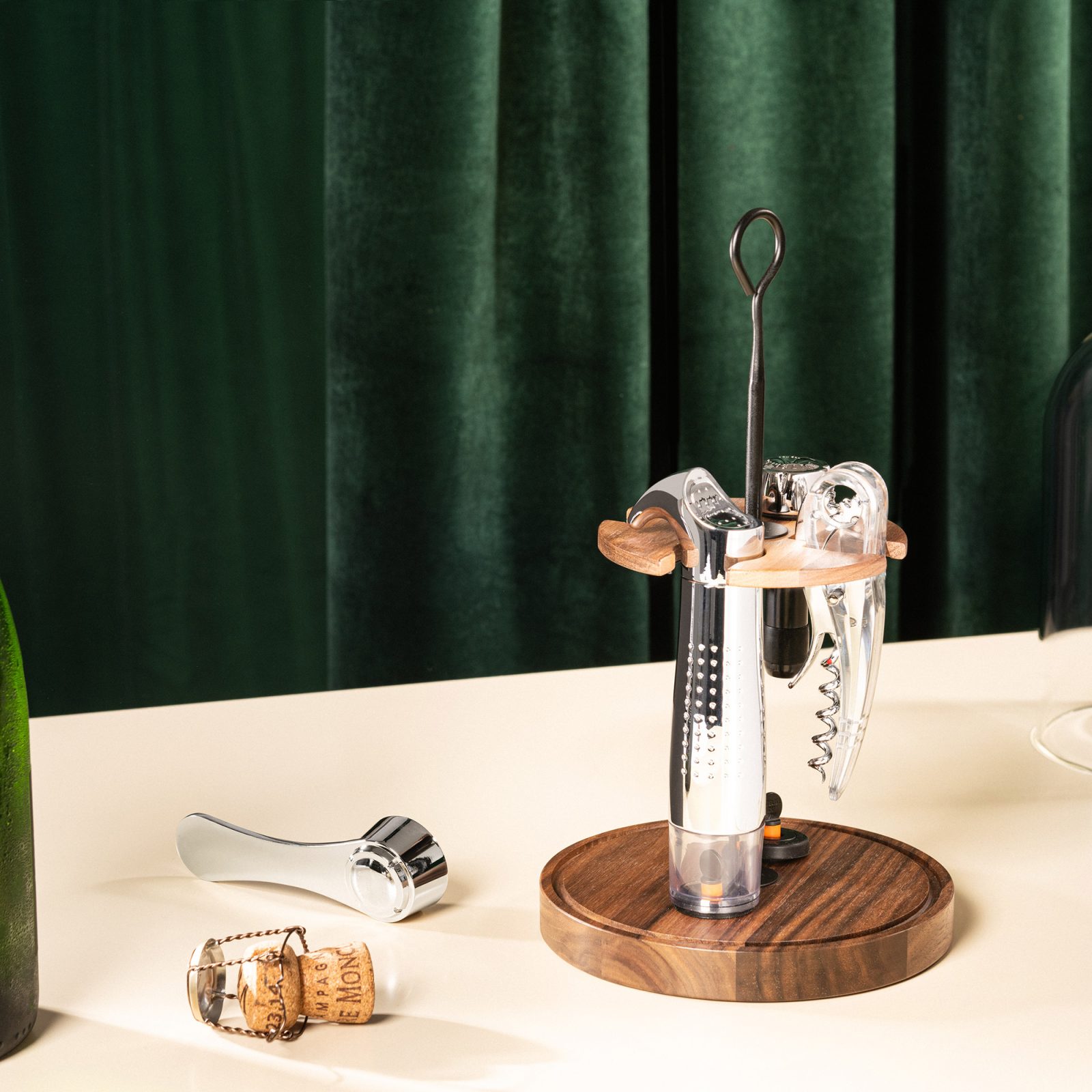 Under the dome you get the full working kit: the Soft Machine Crystal corkscrew for smooth openings, a dedicated Champagne opener, the Gard’Vin ON/OFF Metal wine saver with two stoppers for anything you want to keep overnight, and a Bubble Cork for sparkling bottles that aren’t finished in one go. Nothing complicated, nothing fussy—just the tools that keep an evening moving.