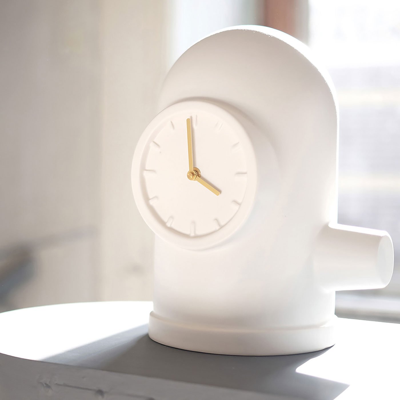 Inspired by industrial shapes, the LEFF Amsterdam Base Table Clock has a particular appearance that is also filled with familiarity. The clock is designed by Kranen/Gille, a Dutch designer duo, and handcrafted by Cor Unum, a ceramic art center based in the Netherlands. The bright white ceramic base has an elegant matte finish, while the brass finished aluminum hands have a golden tone and add a contrasting accent to the minimalist design. The clock has a Japanese movement, a diameter of 7.9’’, and weighs 5.3 lbs. Place it on a home office desk, a night table by the bed, or on a bookshelf in your living room to elevate your home’s aesthetic to new heights of modern style and creativity.