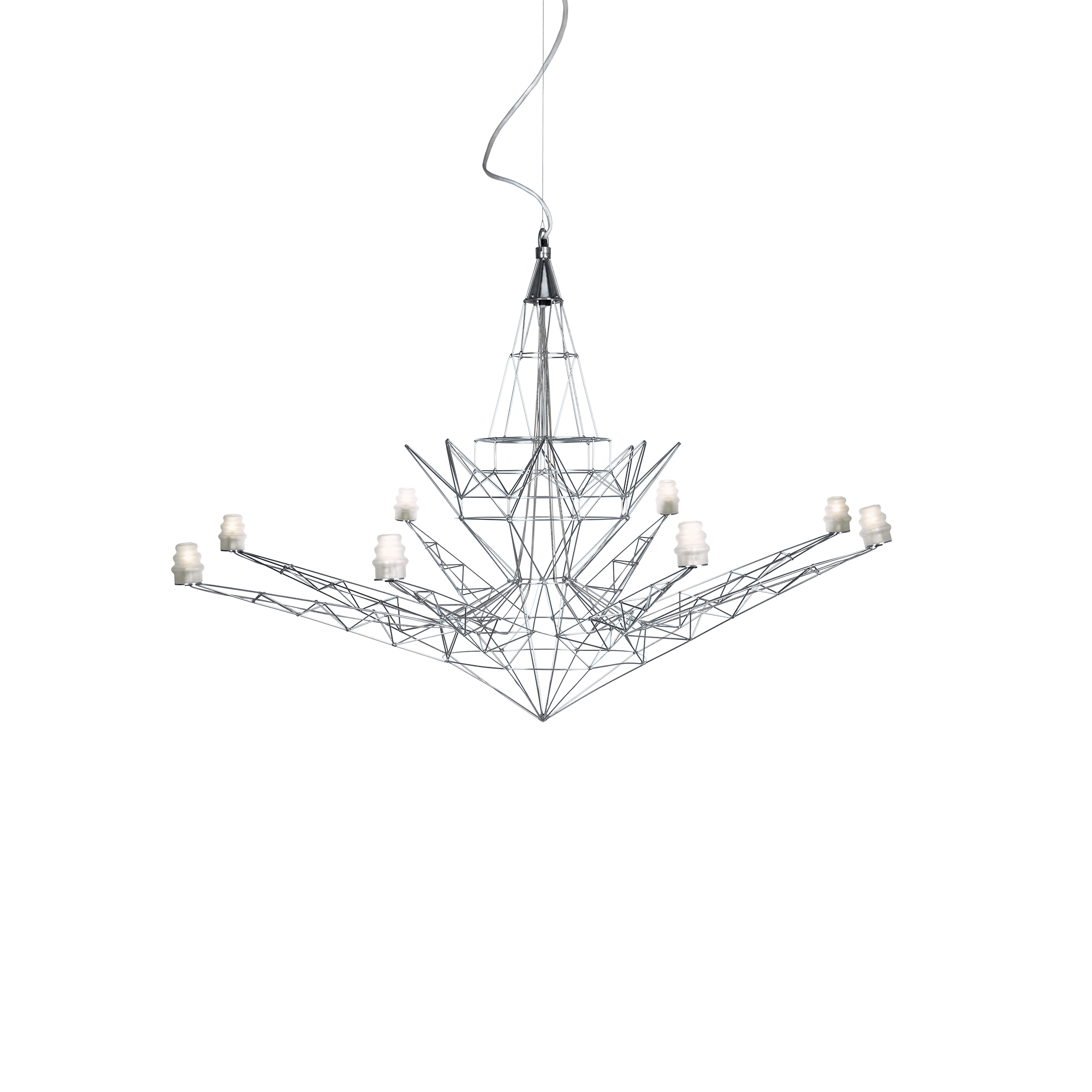 Picture the ghost of a grand Venetian chandelier—every curlicue stripped away until only its steel framework remains, traced in fine welds like a line drawing in space. That’s Tom Dixon’s Lightweight. Eight slender arms shoot out in a starburst, each tipped with a small Murano-glass capsule that softens the lamps to a warm, even glow. Hang it high in a loft or atrium and the open lattice barely interrupts sight-lines; lower it over a dining table and the wiring all but disappears, leaving a floating constellation above the conversation. Made by hand from hundreds of individually cut and soldered rods, the piece bridges old-school metal craft and forward-looking minimalism—equal parts workshop grit and architectural precision. Switch it on and light ricochets through the geometry, throwing angular shadows that shift as you move around the room. Switch it off and you’re left with a sculptural silhouette that feels surprisingly airy for something this unapologetically large.