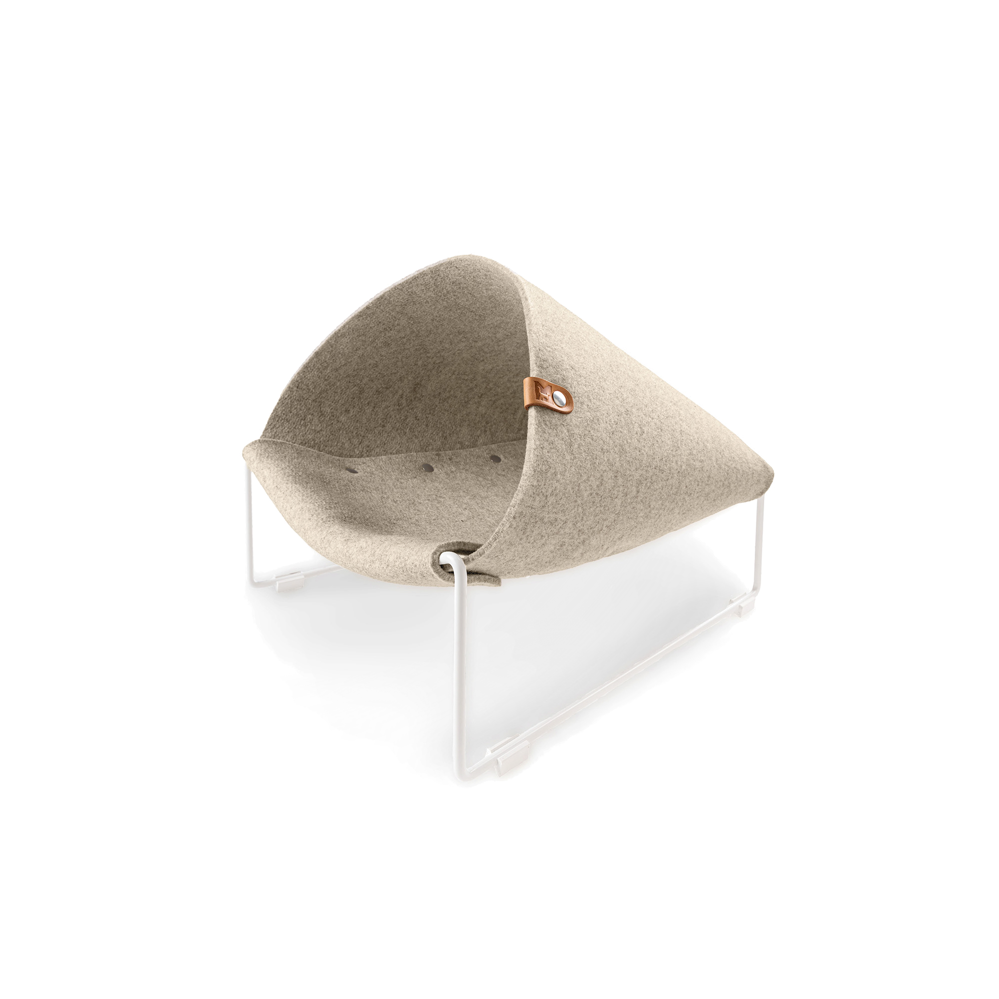 A cat elevated bed and hideaway in one, Loggia lifts a 46 × 42 × 40 cm wool-felt cocoon onto a slim powder-coated steel base. The gentle rise gives felines a clear line of sight while letting them stay tucked inside a breathable 90 % wool shell that keeps its sculptural shape season after season.