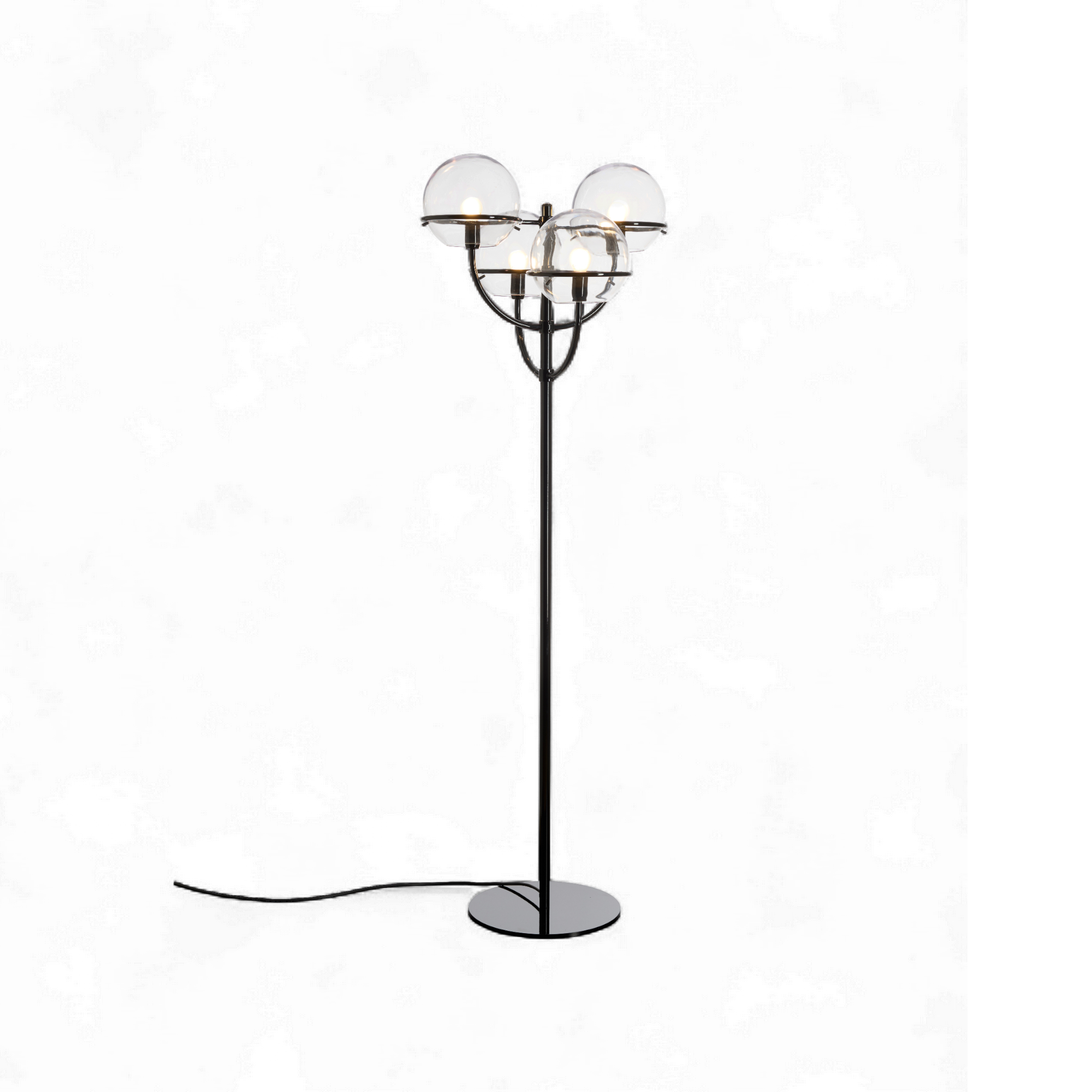 Designed in 1977 by Vico Magistretti for Oluce, the Lyndon floor lamp reduces the classic candelabra to a light metal stem with four transparent polycarbonate spheres. The small dishes under each globe cut glare and keep the light comfortable on eye level.