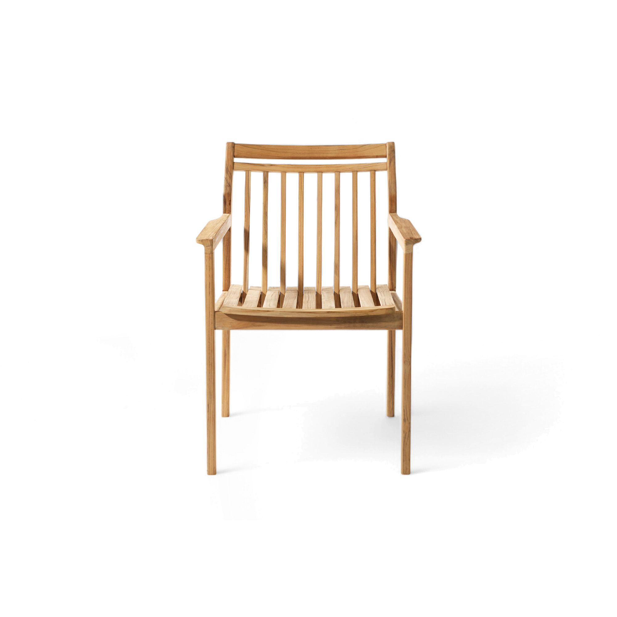 Designed by Thomas E. Alken for FDB Møbler, the M1 Sammen Garden Chair brings the sensibility of Danish indoor furniture outdoors—without dressing it up. The slatted back and seat echo familiar dining silhouettes, while the solid teak frame feels honest and unforced. Subtle details—slightly angled armrests, a gently arched top rail—keep it comfortable through long lunches and slow evenings. The oiled finish highlights the grain without hiding it, and over time, the teak will shift gracefully into a silvery patina. Built to pair with the series’ tables but just as at home on its own, it’s garden furniture with none of the usual clichés.