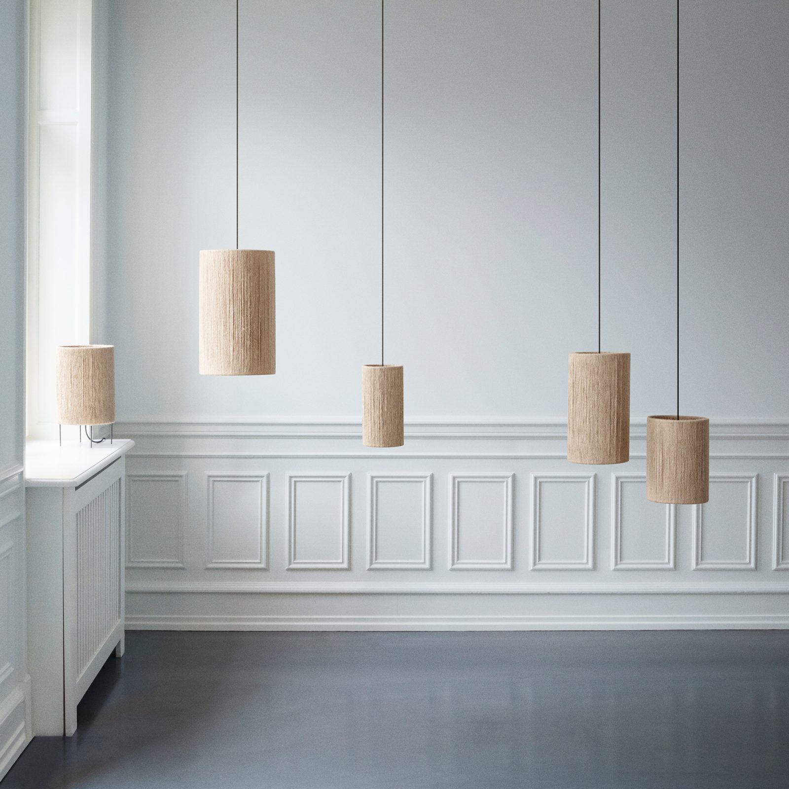Danish design principles meet traditional craftsmanship in the Made by Hand RO lighting series. While it celebrates the artisan quality of 1920s Danish yarn lamps, the RO High Pendant light also takes inspiration from the concept of hygge. Warm and beautifully textured, the lamp has a cylindrical shape created by encircling two iron rings with natural jute yarn. The material has a light beige color and a tactile surface. Turning the lamp on enhances the textures further and creates an ambient, diffused light. A black, braided fabric covers the hanging cord, adding a contrasting accent to the natural color of the jute shade. This series comprises both larger and smaller pendant light, providing an easy way to create an asymmetric lighting composition in a larger room.