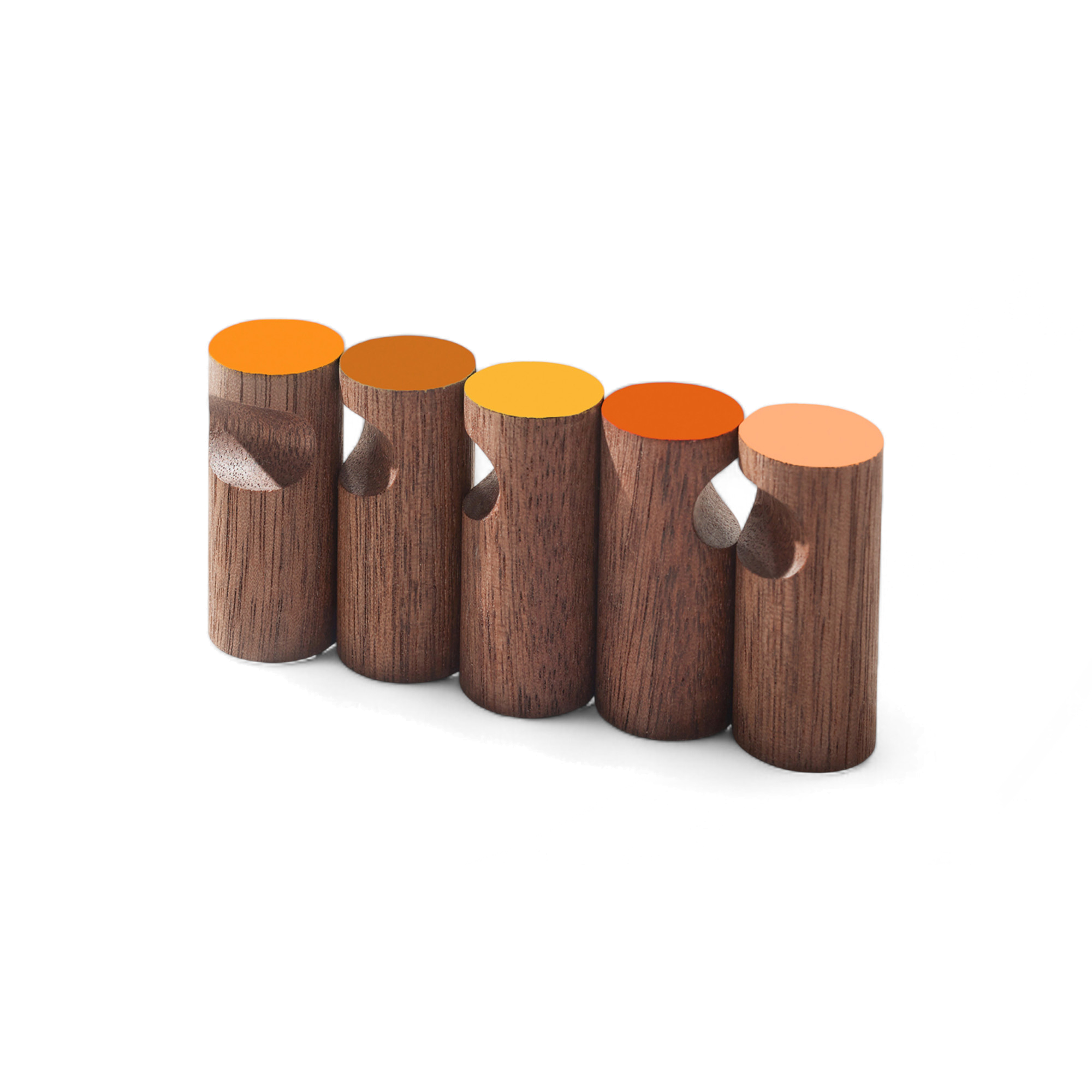 Each piece is turned from FSC-certified walnut, drilled for a thumb-print notch, then hand-painted on top: choose the Multi-Color mix (sun yellow, poppy red, tangerine, mint, sky) or a tonal Oranges suite for a tighter palette. Slide a hook across any steel surface—entry console, range hood, locker, filing cabinet—and the embedded magnet grabs instantly. The wood stays warm to the touch, the satin paint resists chips, and the flat base means the hooks stack like game pieces when not in use.