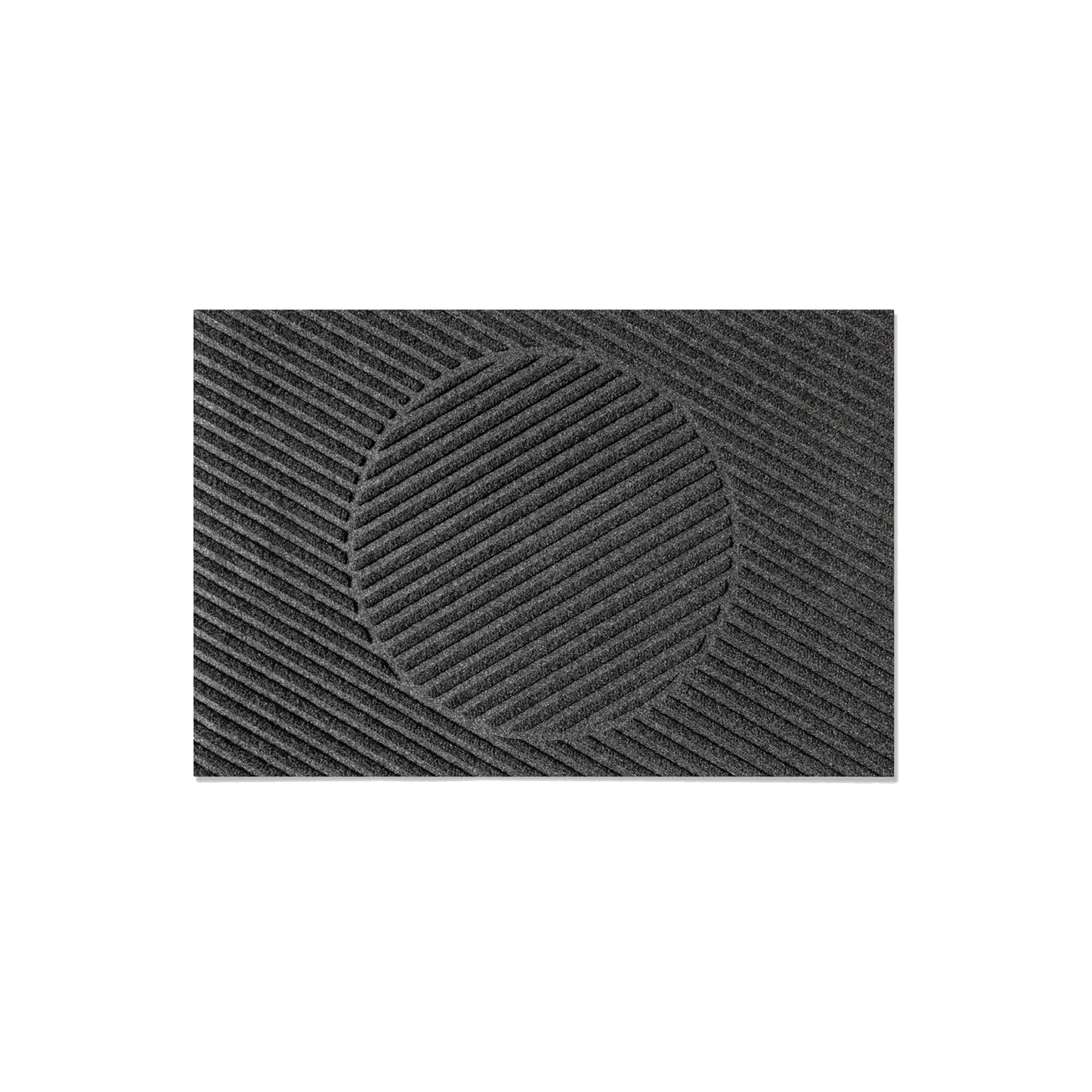 Run a hand across it and you feel the structure: angled ridges do the scraping while the dense pile absorbs water. The nitrile-rubber backing stays put on tile or concrete, so the door swings cleanly without catching. One noticed detail: the center circle reads like a target where shoes land, and it hides traffic well.