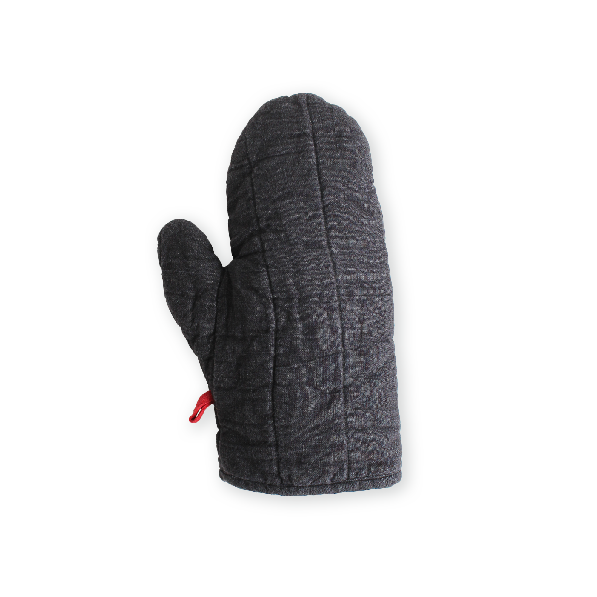 The darkest of the series. The Manon Oven Mitten in Noir is made from washed black linen with a soft cotton interior. It insulates well, moves easily, and fits cleanly without excess bulk.