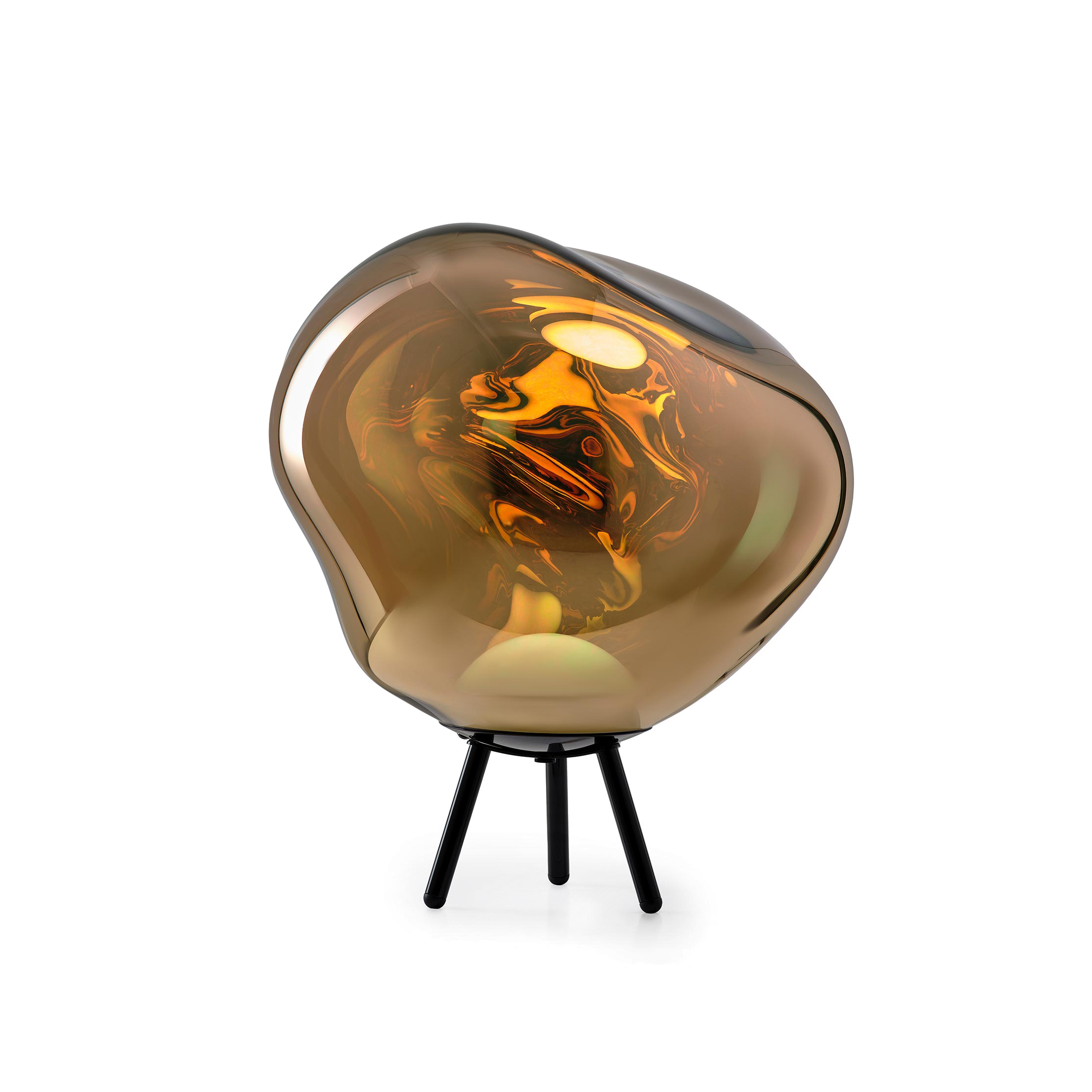 Designed by Tom Dixon and made in Germany, the Melt Large Portable turns the famous distorted orb into a cordless lamp. By day the shell reads as a mirror; switch it on and the globe goes semi-transparent, revealing those swirling “melt” patterns that shift as you move.