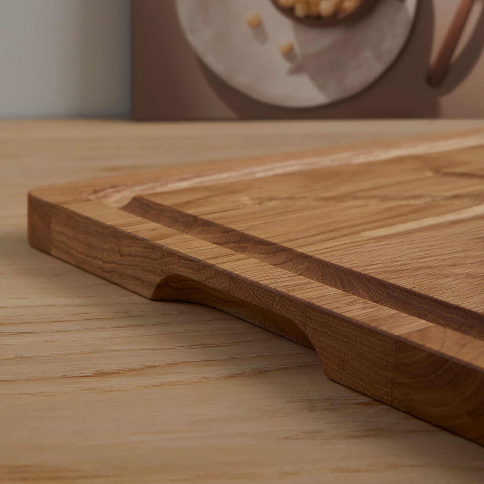 Danish design at its best, the Rosendahl Kay Bojesen Menageri oak cutting board looks beautiful to become a decorative accent in your kitchen, but it’s specifically designed to make food prep and cooking easier. Created by renowned designer Kay Bojesen, the Menageri board has been reintroduced by Rosendahl in an oak version. The branch-like grooves double as practical channels that keep juices contained on the board, instead of leaving them to spill on the countertop or kitchen table. Softly rounded corners and precisely cut grooves showcase the skilled craftsmanship, while the textures of wood add warmth to your kitchen décor. On the bottom, two side indentations provide an easy way to lift and carry this red oak cutting board with fantastic grip. Great for everyday use, this board is ideal for all your food cutting, slicing, and chopping needs. Manufactured from FSC-certified wood, the Kay Bojesen Menageri Chopping Board is as eco-friendly as it is high-quality and durable. Perfect as a housewarming gift.