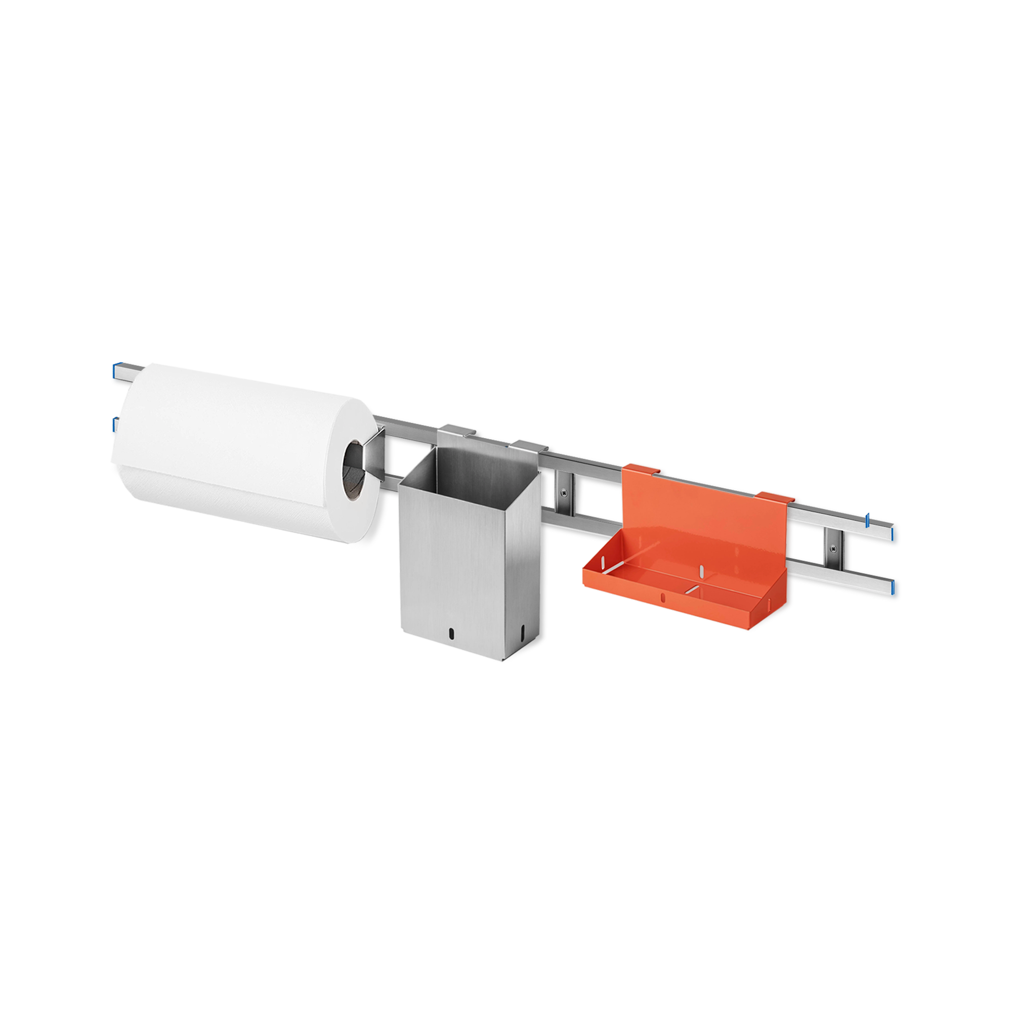 Then you add the pieces that match your habits. The RS-C10 Rack Container is the one for non-magnetic tools—wooden utensils, chopsticks, a peeler, a slim brush. It’s available in stainless steel or orange, and it sits firmly thanks to a magnetic base plus the top hook tabs. The RS-S20 Rack Shelf gives you a small ledge for the items you reach for constantly—spices, oil, salt, small bottles—also in stainless steel or orange. The RS-PRH Paper Roll Holder puts paper towel on the rail, right where spills happen, without giving up drawer space. And if your wall can take more, you can link multiple RS-M40 racks to build a longer run. It’s all clean steel, easy to reconfigure, and it looks like it belongs in a kitchen that actually gets used.