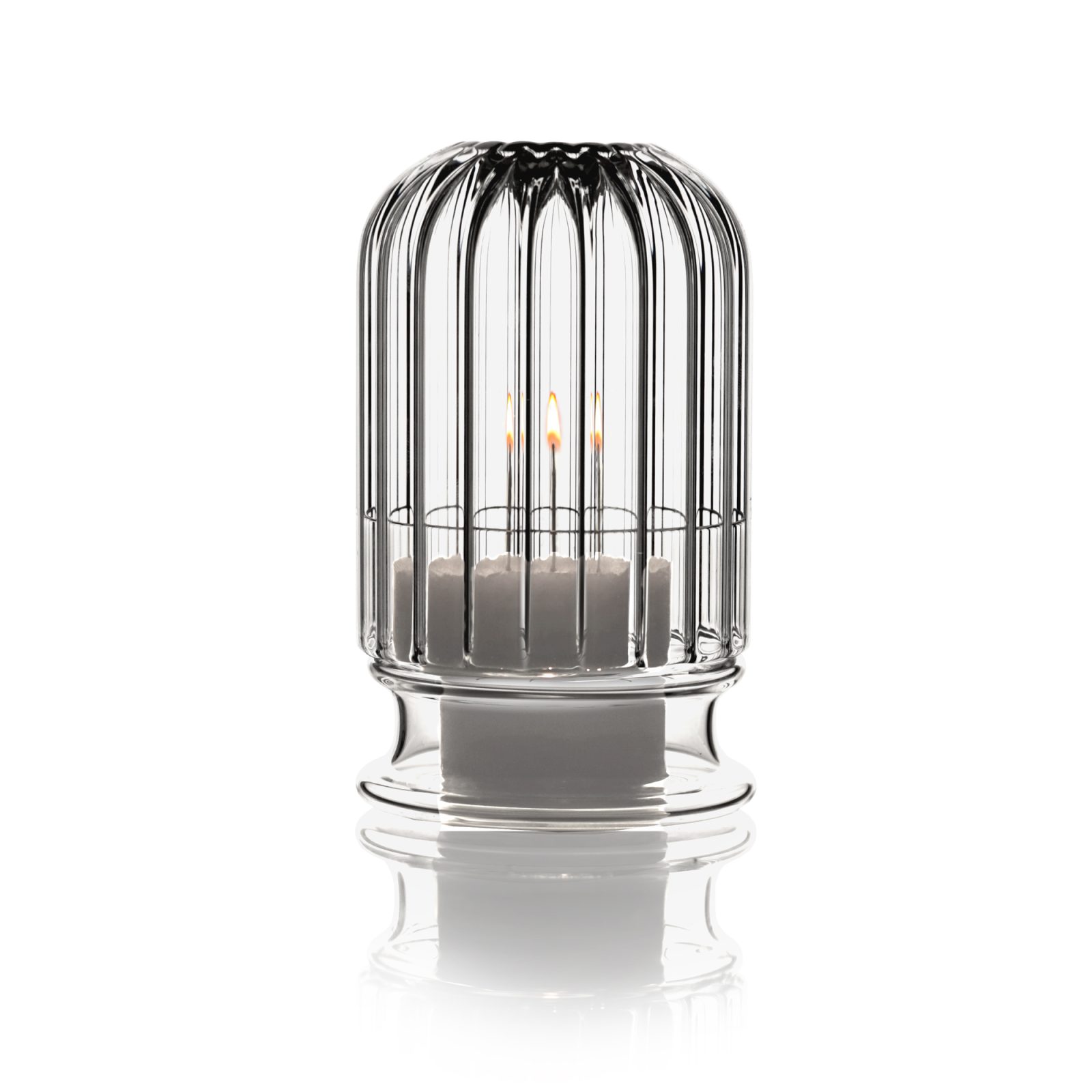 Moscardino is a distinctive candle holder featuring a protective cloche, handcrafted from borosilicate glass. Its design makes it suitable for both indoor and outdoor use, with the glass dome offering a windproof function, ensuring the candle remains lit even in breezy conditions.