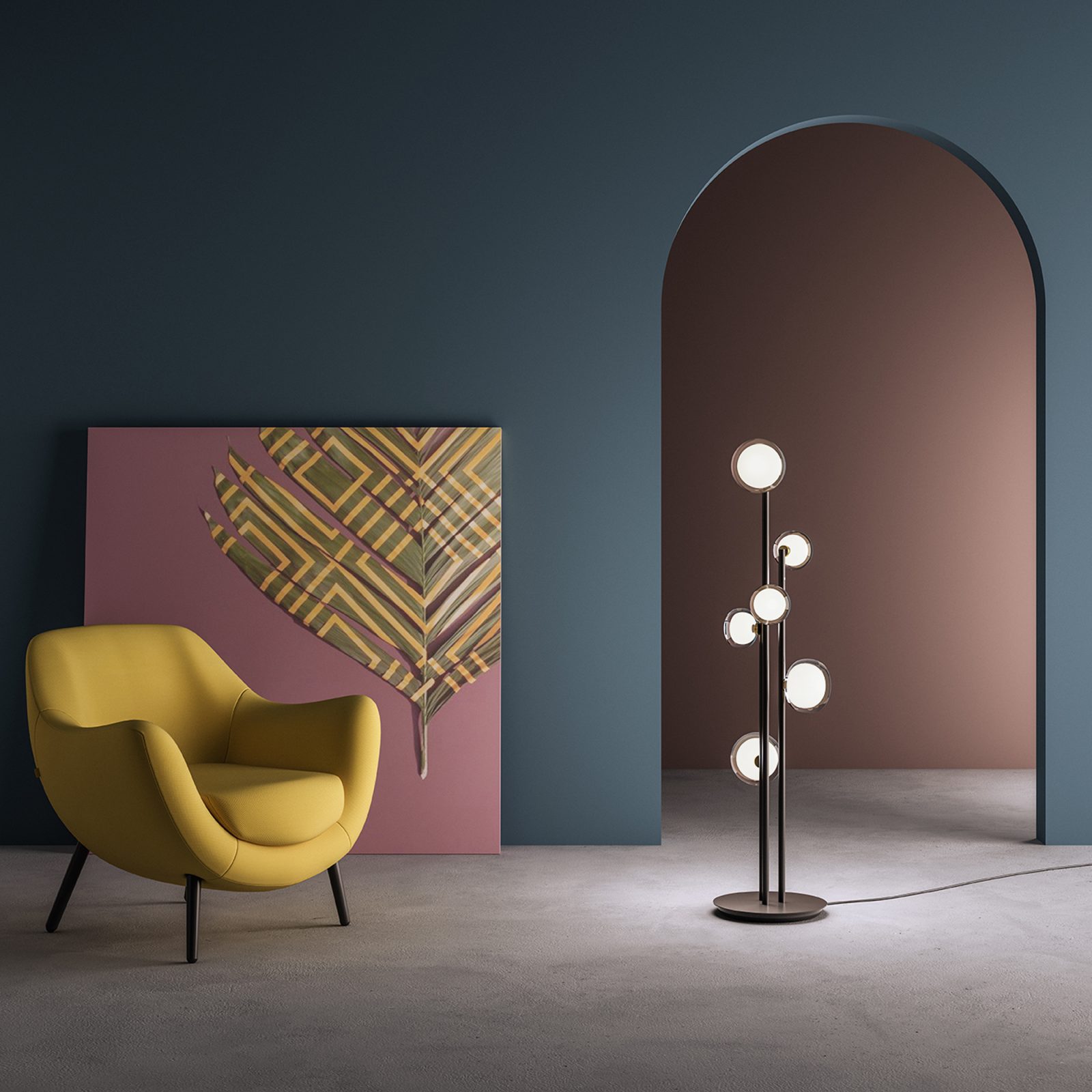 50s inspired collection of elegant and sophisticated lamps representing the detail to enrich any location. A double-sided spherical bright object in borosilicate glass makes these lamps available in different compositions and a structure made by metal coated with epoxy powder enriched with brushed brass or black chrome details. Different varieties are available for any situation: chandeliers (in five different models) or table lamp, bedside (smaller), floor or wall (available in three different models for single or composite personalized installation). Richness and sobriety all in one single element.