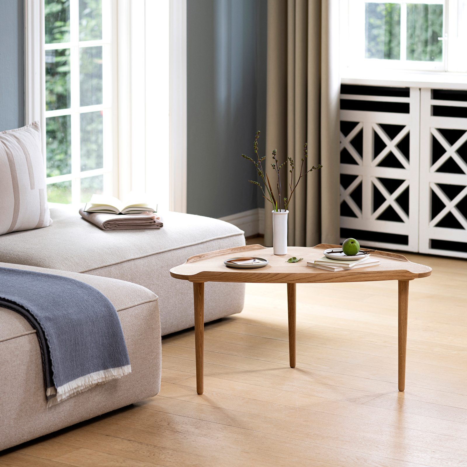 Petals, leaves, a guitar pick. Regardless of what its silhouette reminds you of, the No. 55 Table has a distinctive style that brings charm and timeless Danish elegance into your home. Designed in the 1950s by Jørgen Aakjær Jørgensen, this Intarsia Furniture table was relaunched in two versions that perfectly suit modern interiors. Available in two sizes and two heights, the No. 55 tables can be nested in a living room to save space. Both versions feature a triangular top with curved corners and a traditional chamfered edge. Three tubular but slim legs provide excellent support while giving a light look to this versatile coffee table. Available in natural, white oiled or smoked oak versions, the Intarsia Furniture No. 55 Table blends into any décor with ease.