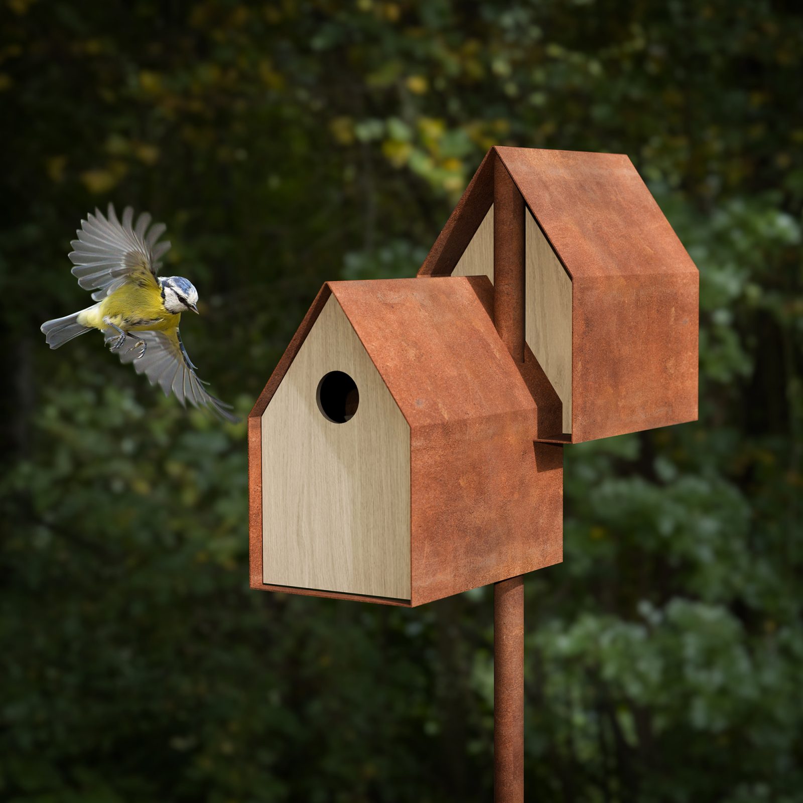 Inspired by the nesting behaviors of sparrows, the Frederik Roijé Noaste Noaber bird house with pole base features two neighboring nests that allows the birds to live close to each other. The design references residential architecture with gabled roofs, adding a charming accent to any outdoor space. With this bird house, pole mount installation is easy, as you can simply stick the tubular support in the ground anywhere in your garden.