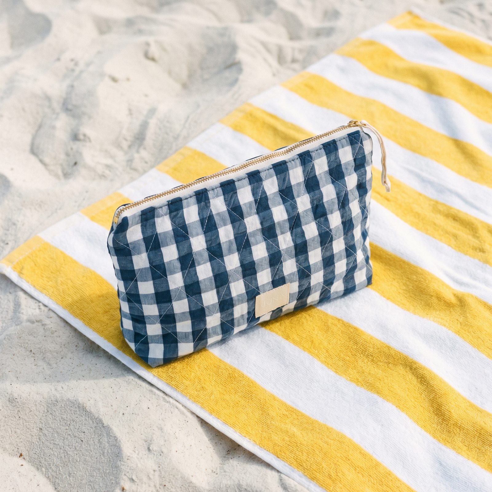 The JUNA Nola Makeup Bag is a small quilted pouch that keeps the usual chaos in one place—makeup, chargers, pens, earbuds, whatever you’re carrying that week. The Dark Blue/White check gives it a crisp, everyday look, and the zip opens wide enough that you’re not digging around with two fingers like a raccoon.