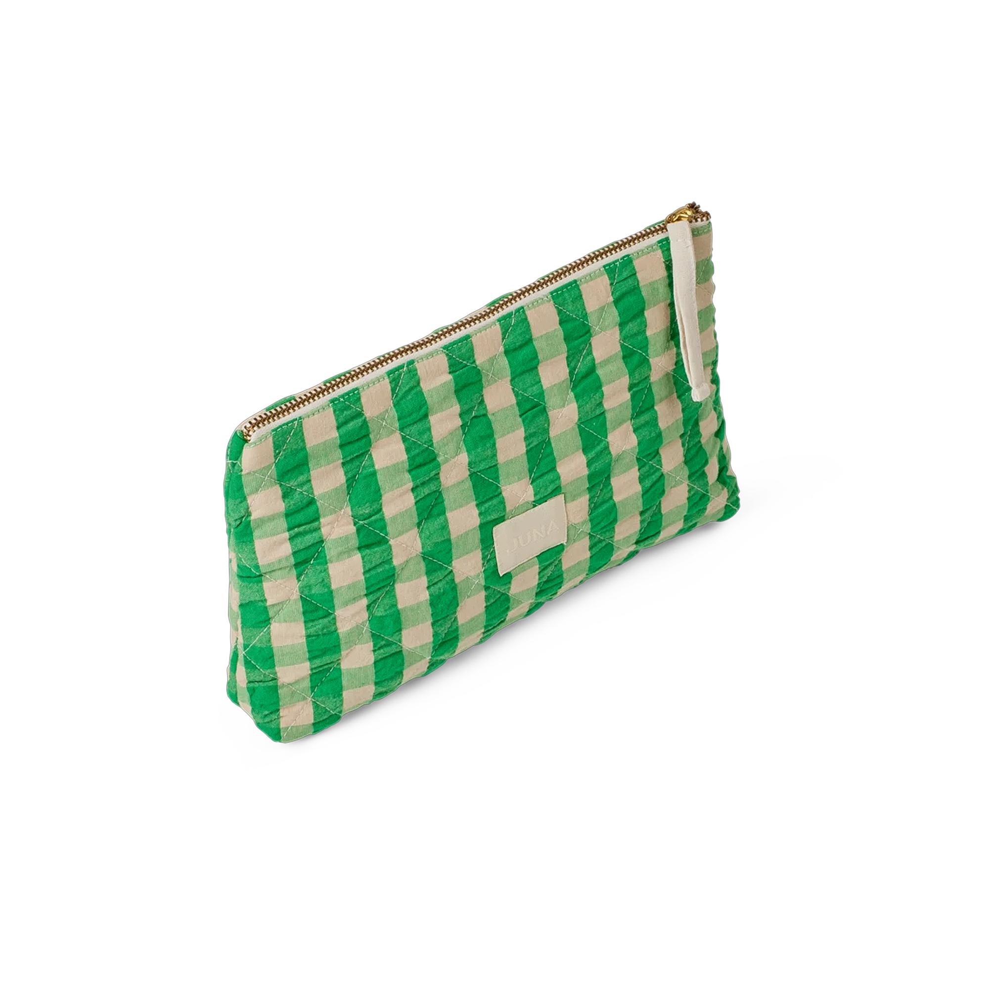 The JUNA Nola Makeup Bag is a small quilted pouch that keeps the usual chaos in one place—makeup, chargers, pens, earbuds, whatever you’re carrying that week. The Dark Blue/White check gives it a crisp, everyday look, and the zip opens wide enough that you’re not digging around with two fingers like a raccoon.