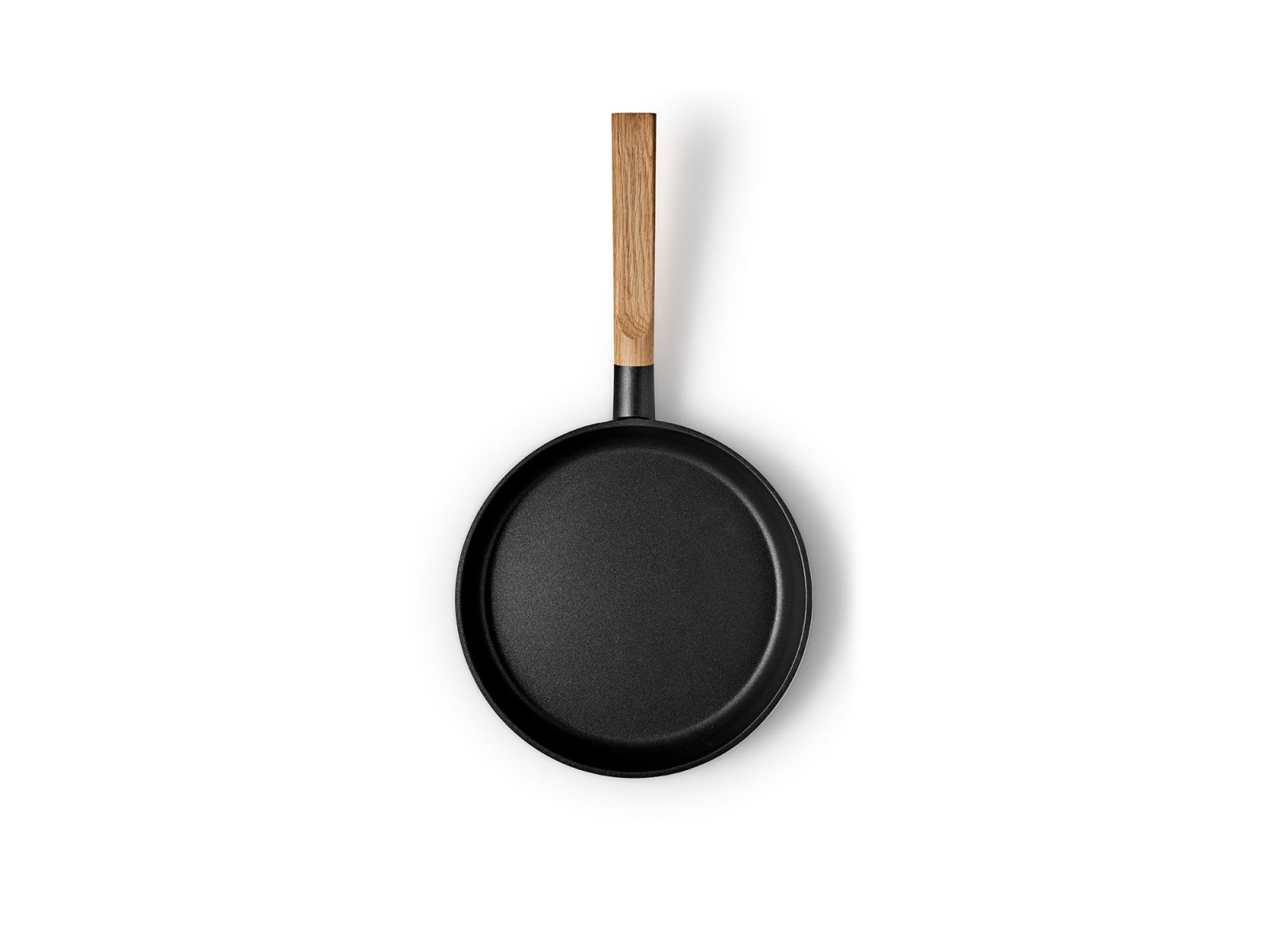 Stylish and practical, the Nordic Kitchen series made by Eva Solo transforms modern kitchens with its elegant Scandinavian design. Lightweight and finished with a wooden handle, the aluminum frying pan is easier to handle than a cast iron product. It also boasts a non-stick PFOA-free PTFE Slip-Let® coating, so it will require only a small amount of oil when cooking and will be easy to clean. Use this non-stick frying pan to fry meat and vegetables on any type of heating source, including induction stoves. We recommend using a potholder while cooking, as aluminum has excellent heat conduction properties and warms up the wooden handle. Available in two sizes: 24 cm and 28 cm.