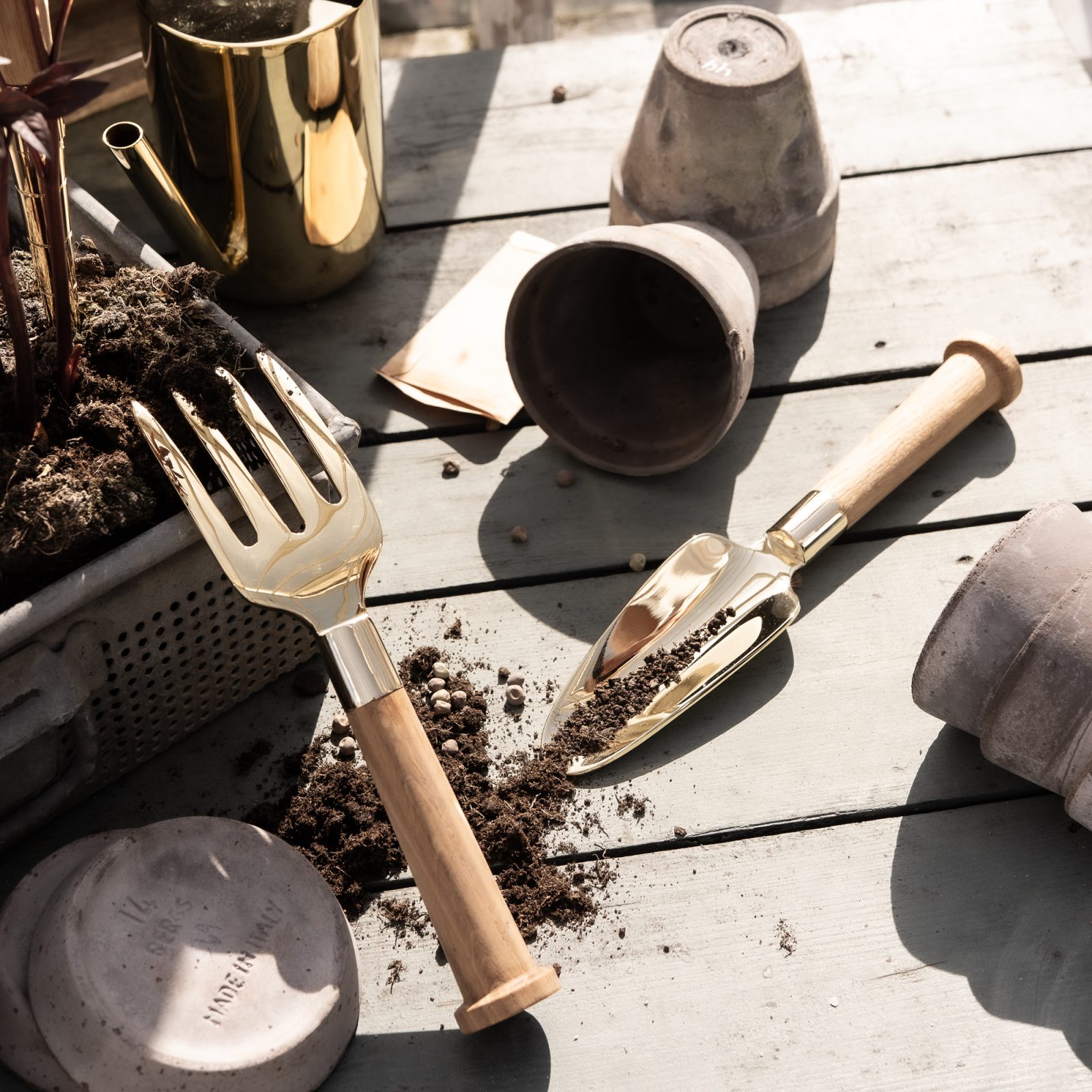 Ilse Crawford created the Nurture series for people who want plants to be part of everyday home life, and for the tools we use with them to feel as considered as anything else we keep around. Her approach is clear in these pieces: solid brass heads paired with Swedish oak handles, designed to be practical first and visually calm in a room. The brass reflects light when new and gradually darkens with use, showing the mark of time in a way that suits the purpose of the tools.
