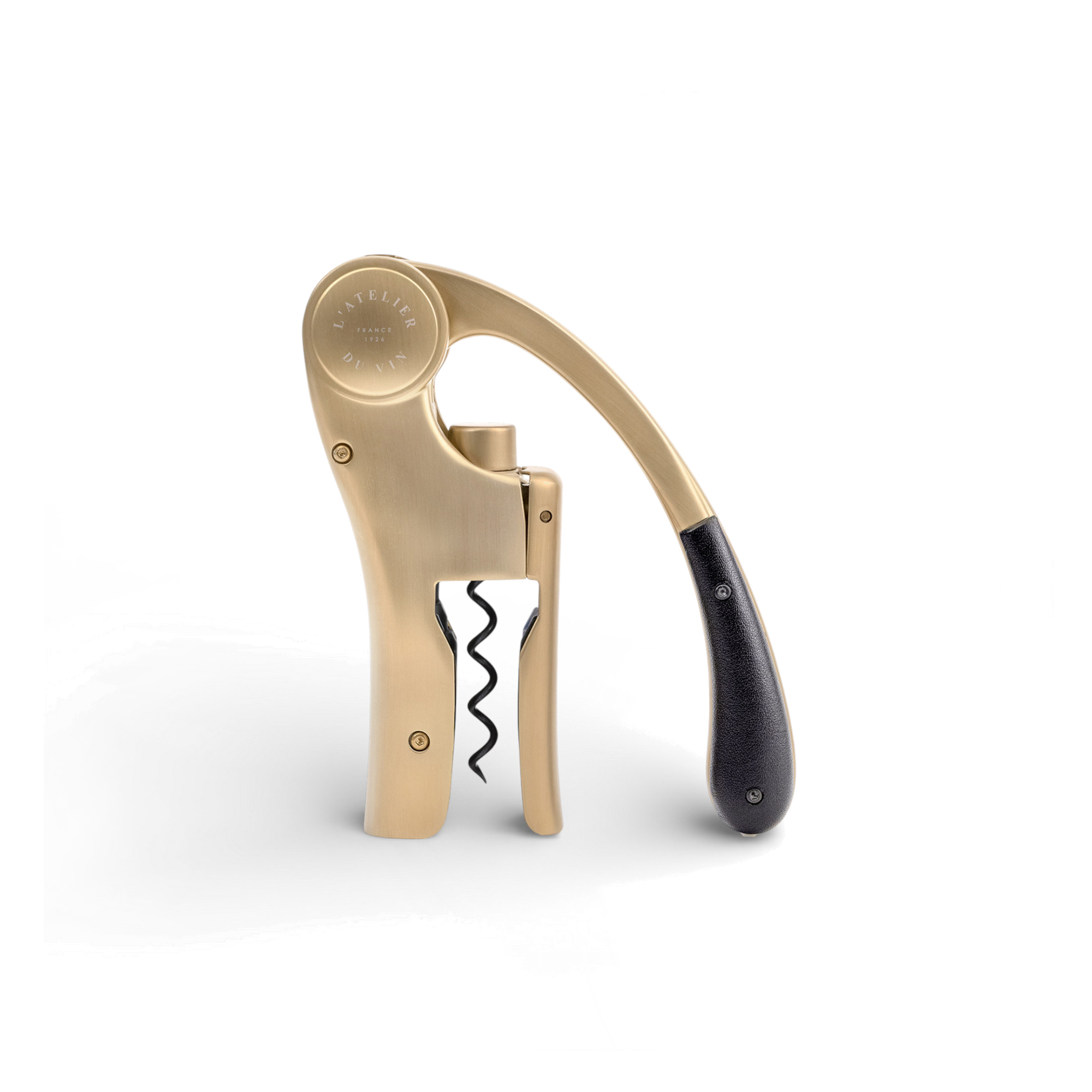 The opener itself is the Oeno Motion lever mechanism in an amber-gold finish, with a black leather handle where your hand lands. Clamp it on the bottle neck, move the lever, and the cork comes up in a clean, controlled sequence. Small details are handled, too: a leather guard for the spiral, and a general sense that this was designed by people who actually open bottles in real life.