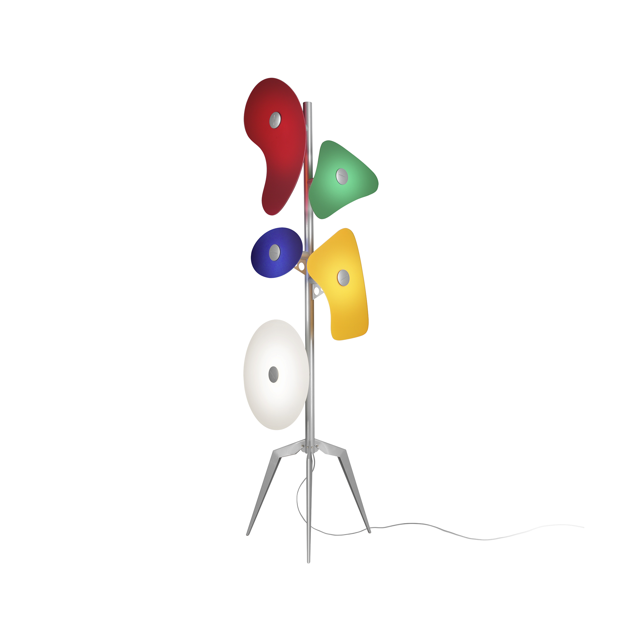 Laviani’s 1992 Orbital still feels like pop-art in motion: a slim steel spine on a three-point base, fanning out five glass “petals” that read more collage than lampshade. In white, the overlapping silhouettes look crisply graphic, like cut-paper forms frozen mid-flight; choose the multicolor set and the lamp turns into a standing Joan Miró—quiet by day, carnival by night. Every diffuser is satin-matte outside, glossy inside, so light slips across the surface but bounces back through the glass, casting soft pools while keeping the colors saturated. A quick swivel of the tripod lets you angle the composition, as if rearranging pieces on an easel. Sculpture first, floor lamp second, Orbital lands in a room with the confidence of something that knows it changed the conversation once—and can do it again whenever you flip the switch.