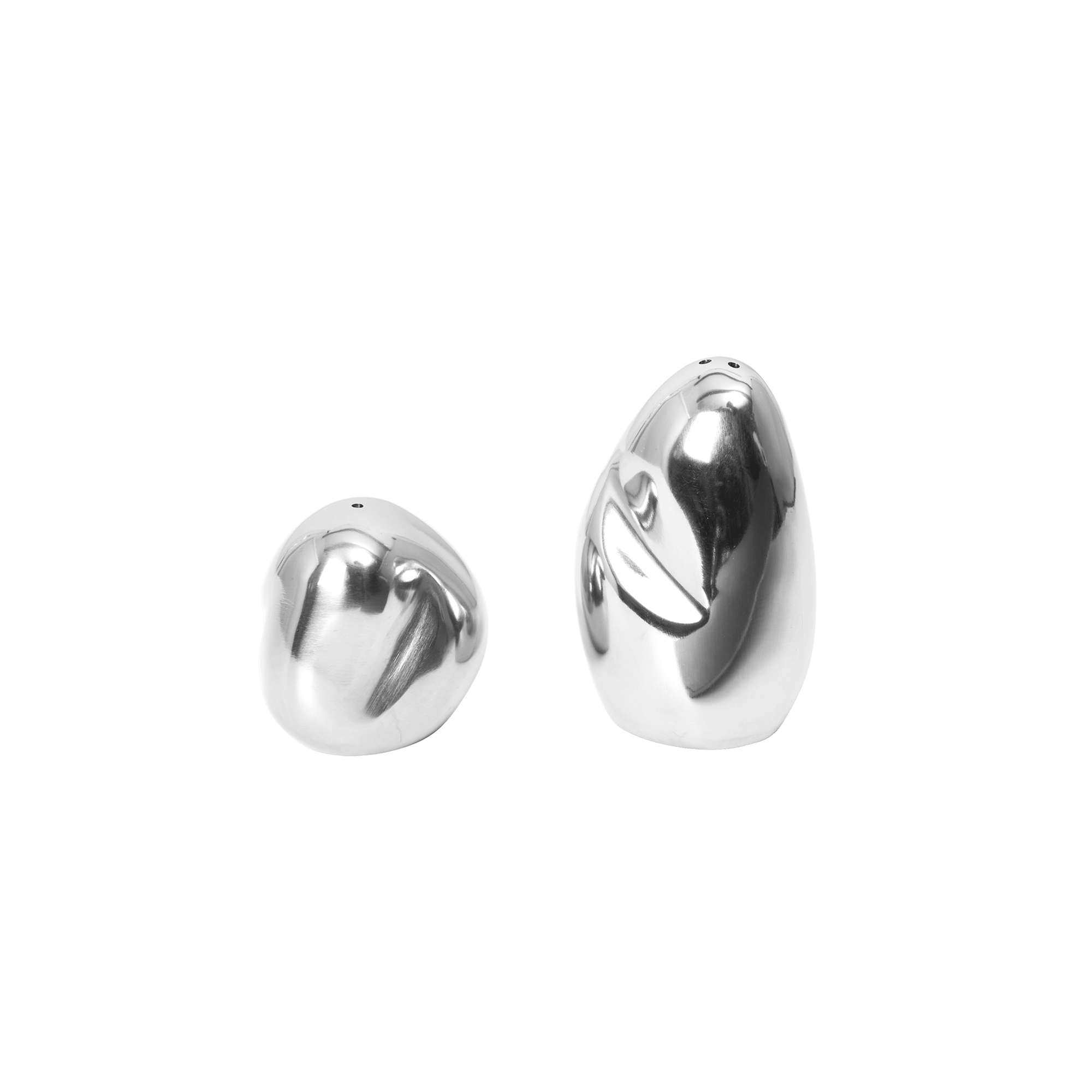 A stainless steel salt and pepper shaker set that feels more like sculptural objects than tableware.