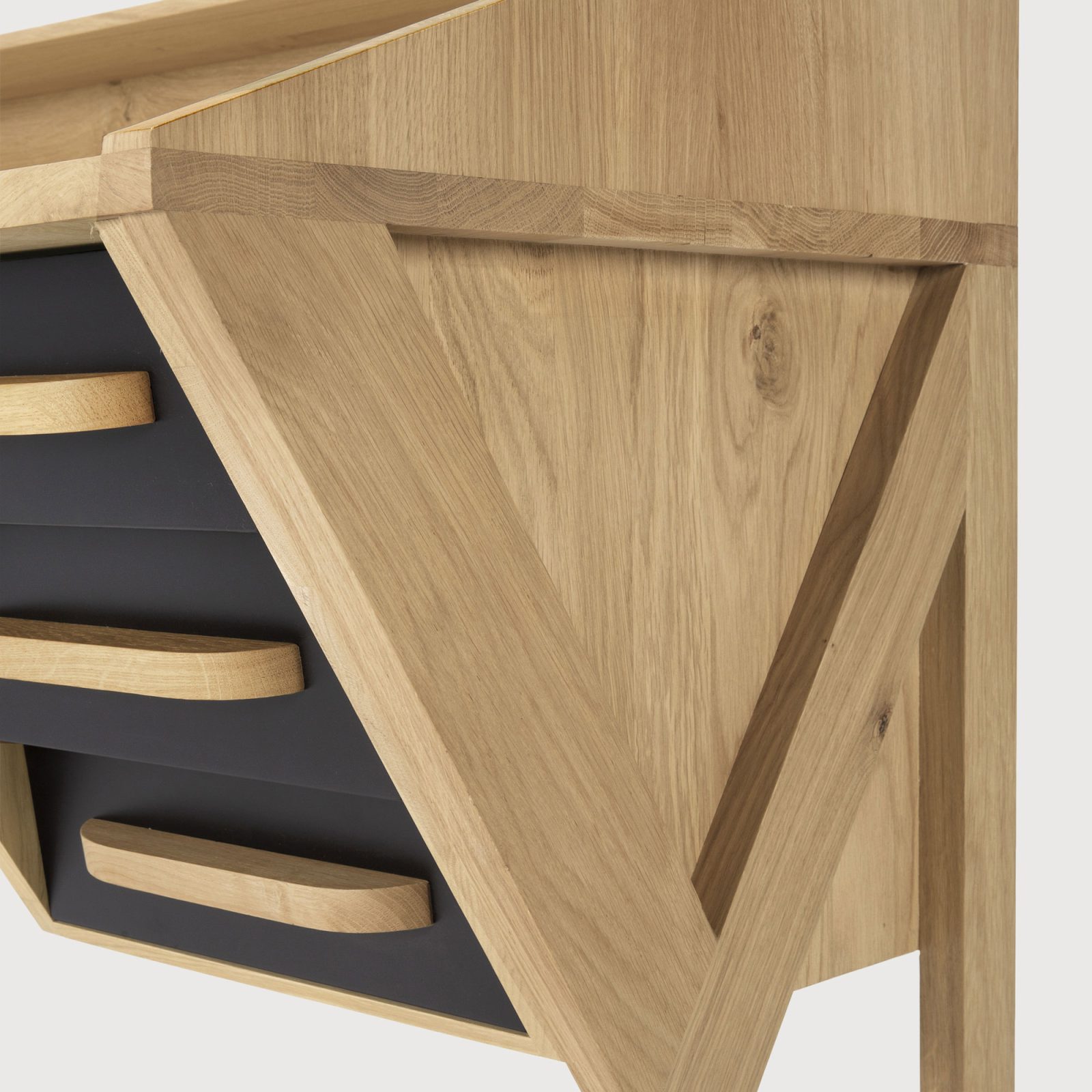 Inspired by retro-style furniture, the Ethnicraft Origami Desk offers the perfect way to create a fun but stylish and extremely practical workspace at home. The desk features origami-inspired details in dark or light hues that contrast the natural colors of solid oak. Maximizing function, each desk features two drawers on the upper left side, three larger drawers on the lower right side, and an open shelf beneath the top. Additionally, the top of the Origami Desk allows users to place a range of items to keep them close at hand, or decorative objects like small plant pots, vases or artworks. Crafted from solid oak, these desks feature a hardwax oil finish.