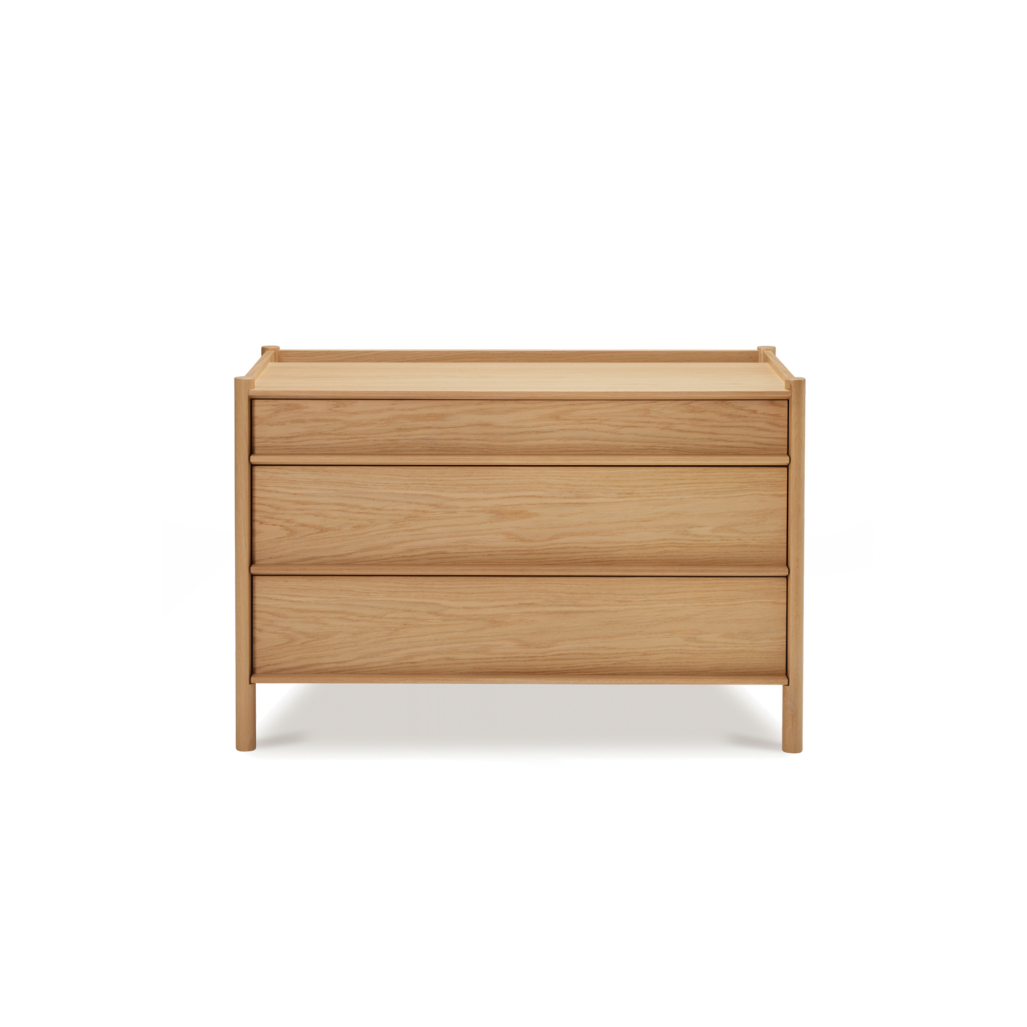 You get three drawers with a clear logic. The top drawer is shallower and includes a divider for the smaller stuff that usually ends up floating around. The two lower drawers take the bulkier things—folded tees, sweaters, linens, cables—whatever you want out of sight. The top edge has a narrow recessed trough. It’s useful in a daily way: keys, glasses, a watch, a pen. It also gives you a clean spot to lean a small frame or print, so the top stays usable.