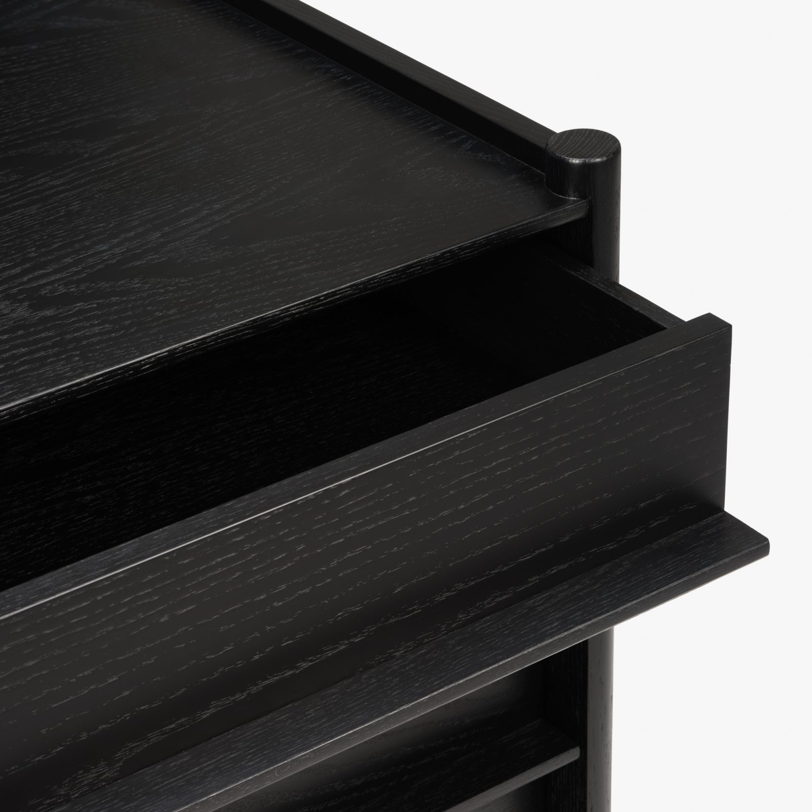 The drawer layout is practical: two deeper drawers at the bottom for bulkier items, and shallower drawers above, including a top drawer with an internal divider for smaller things. Along the back edge of the top surface, a narrow recessed trough gives you a neat place for everyday items and a simple way to lean artwork or a framed photo without taking up the full top.