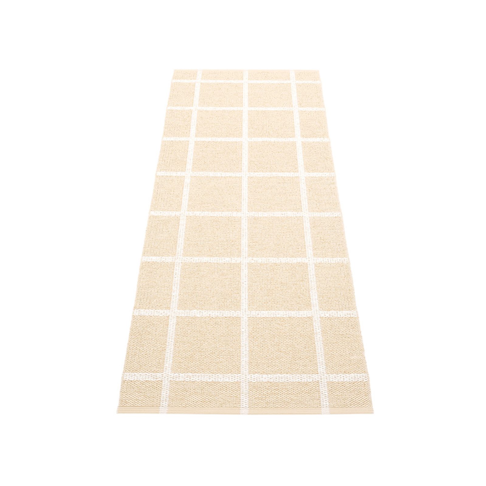 Discover ADA, a rug that transforms traditional design with its chequered pattern, reminiscent of classic wallpaper styles. Yet, ADA goes beyond conventional aesthetics. It challenges the norms of weaving with an advanced approach, creating an innovative and captivating design. Pappelina’s skilled weavers have tirelessly innovated and refined their techniques to craft ADA, blending two distinct weaving methods that intersect both vertically and horizontally to create a stunning visual impact. This breakthrough in weaving technology not only enhances the rug’s appearance but also its functionality. ADA stands out as a non-absorbent, hygienic rug that resists dust accumulation, making it an excellent choice for allergy sufferers. Explore the unique charm and sophisticated appeal of the Pappelina plastic rug ADA in Cream color, a piece that redefines spaces with its depth and intricacy.