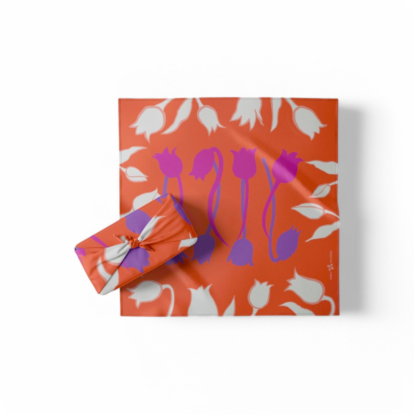 Muted earth tones meet bursts of lavender and lilac tulips in a design that feels both gentle and grounded. The arrangement plays with symmetry and natural shapes, offering a wrap that’s easy to pair with anything—gift boxes, books, bottles, or even a casual tote moment.