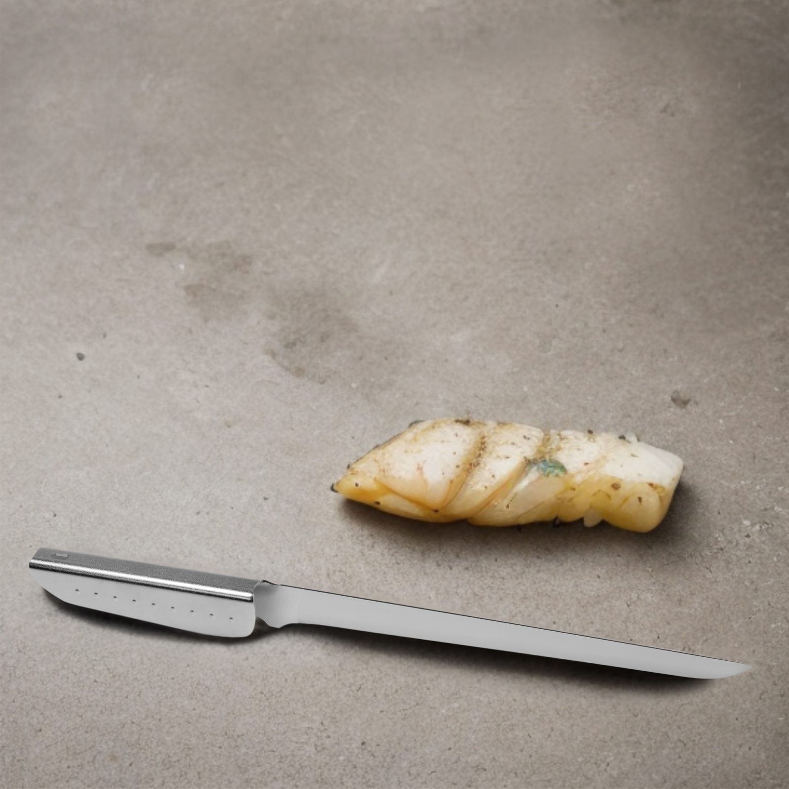 The Tiziano Paulon Fillet/Slicing Knife is a professional-grade kitchen tool designed for filleting fish with precision and ease. Its highly flexible blade also excels at slicing meats like roast beef and prosciutto. Crafted through years of research and innovation, it features an ergonomic handle for a secure grip and optimal control. The hand-sharpened blade, made from a special carbon steel alloy, ensures razor-sharp cuts and long-lasting performance. Complete with a protective sheath for safety and hygiene, this knife is an essential addition to any kitchen, offering versatility, durability, and quality craftsmanship.