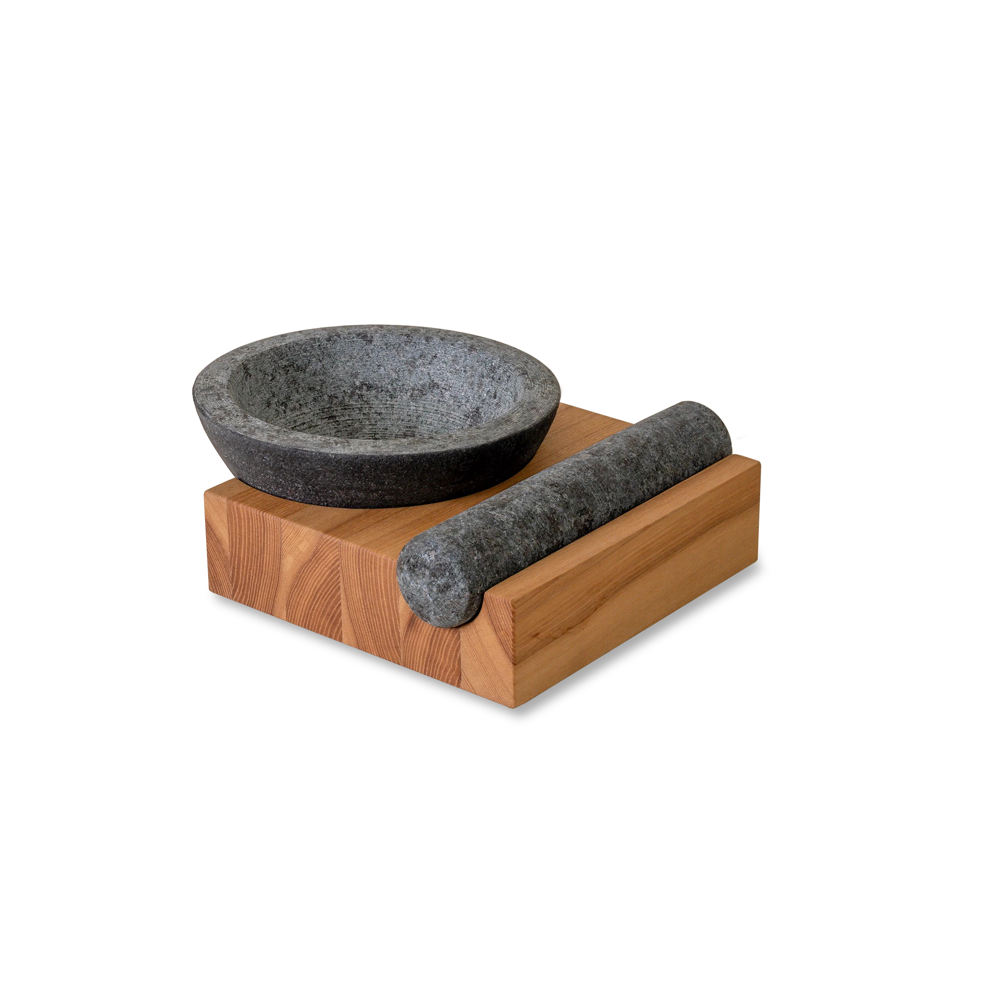 Holcomb’s Perch takes the classic stone setup and fixes the annoying parts with a simple, smart base. The heavy, textured granite bowl stays put, while the angled ash-wood perch tilts it just enough to give you better leverage as you grind. That means dried chiles break down faster, spices crush more evenly, and curry pastes come together with less effort—and less splatter. The wood also acts as a buffer between stone and countertop, and it develops a smoother fit over time as it’s used. The pestle stores right on the base, so the whole thing lives as a tidy, ready-to-go station.