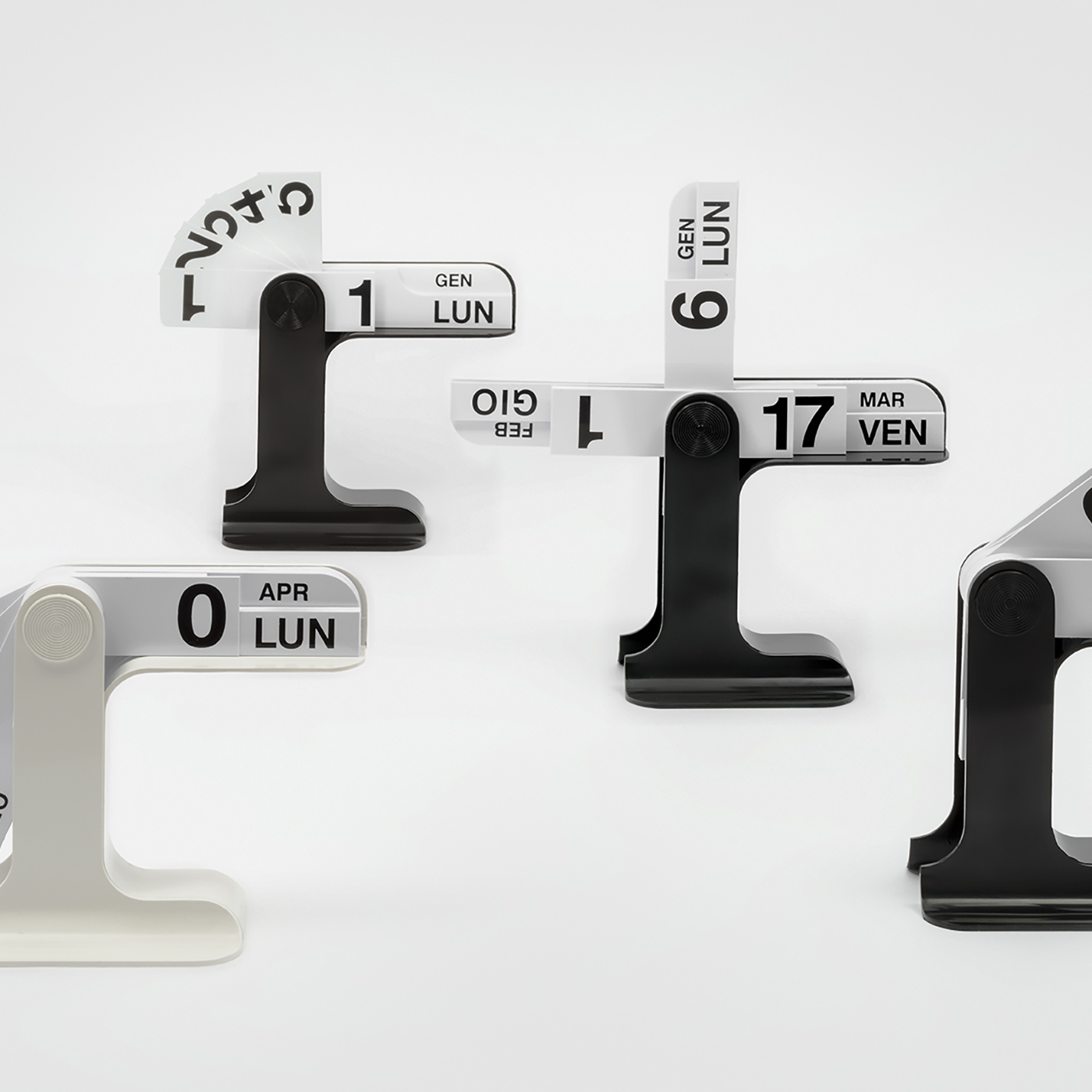 “Vintage industrial style meets Italian refinement in Timor. Part of the Danese Milano collection since 1967, this Enzo Mari design makes the passage of time personal. Designed as a desk perpetual calendar, Timor requires the user to interact with it daily in order to show the correct date. The PVC cards show the days of the week, the months, and dates. To display the current date, the user only needs to fan out the correct cards from the central pivot. This system provides a perfect solution to become more mindful of the passing of time and thus slow down to appreciate every moment. At the same time, Timor brings iconic Italian design to your workspace, whether at the office or at home.