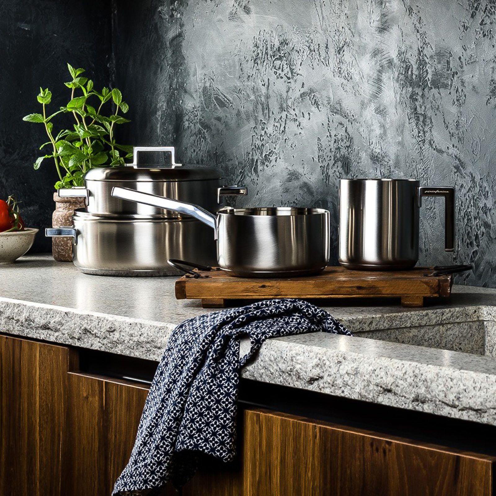 A good sauté pan should be versatile. A great one should also look fantastic even in the most elegant kitchen. This Stile Sauté Pan does both. Made by Pininfarina, the brand established in 1930 by legendary Italian designer Battista “Pinin” Farina, the Stile line is as practical as it is stylish. The pan combines rounded and angular elements as well as glossy and matte surfaces. While the bottom has a rounded shape to eliminate damage to induction or ceramic hobs, the lid has a similarly rounded silhouette to create a seamless design. Two handles on the sides provide perfect grip thanks to comfortable round edges and extra-thick build. A larger pan from the same collection is also available, along with other products from the Stile line. This range has received the 2018 Red Dot Design Award. Made in Italy.