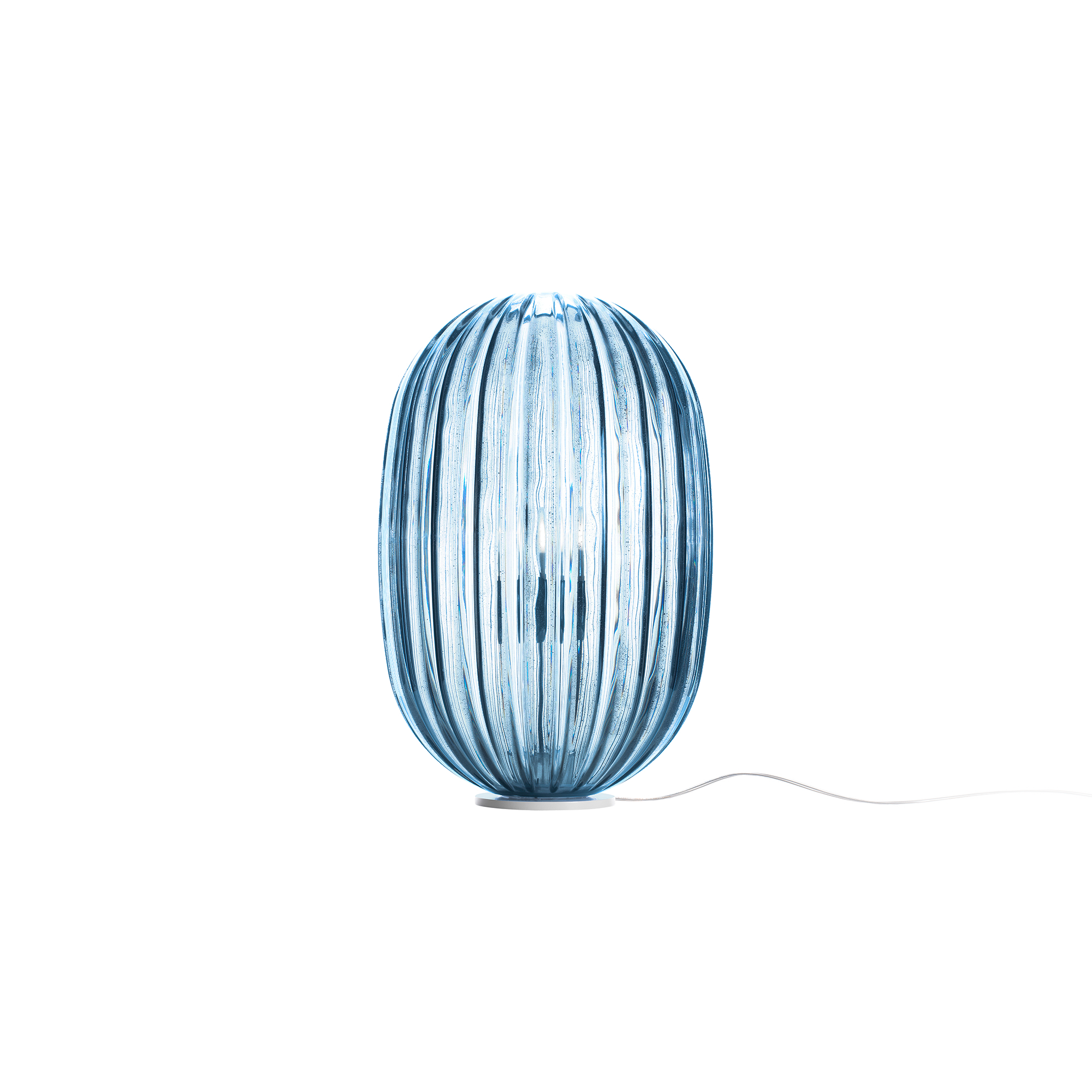 Plass Media translates the shimmer of a Venetian glass bead into a lamp you can set on a credenza or wide sill. Luca Nichetto swaps fragile crystal for rotational-molded polycarbonate, then scores the shell with irregular grooves that catch and refract the interior bulb. Switch it on—via simple rocker or in-line dimmer—and the shade glows like sunlit water, throwing rippled bands of light onto nearby surfaces. At about the size of a melon, it’s large enough to anchor a corner but still easy to move, thanks to a transparent cord and lightweight steel base. Choose misty Grey for a smoky glow or Azzurro Light Blue for a coastal tint; each finish carries subtle bubbles and striations that echo hand-blown glass. Whether perched alone or paired with the larger Plass suspension above, the lamp brings a quiet play of texture, color, and shifting light to any medium-scale space.
