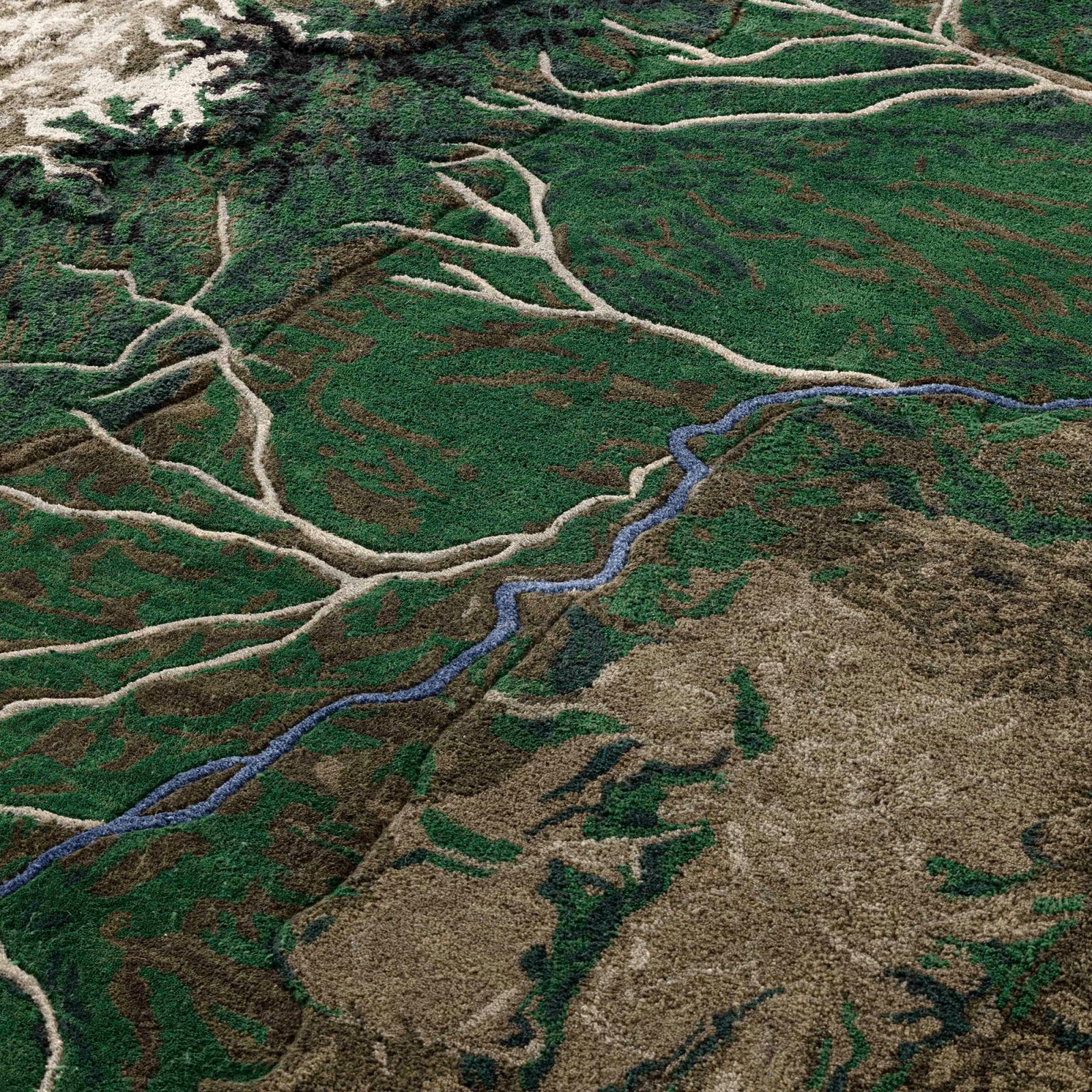 The Plastic Rivers Ganges Rug by Álvaro Catalán de Ocón transforms satellite imagery into a textured, hand-tufted design made entirely from 100% recycled PET. Representing one of the most polluted rivers in the world, this rug highlights the devastating impact of plastic waste while reclaiming that same material into something meaningful. With varying pile heights and intricate detailing, it captures the fluid movement of the Ganges, making it both a statement piece and a reminder of the urgent need for environmental responsibility.