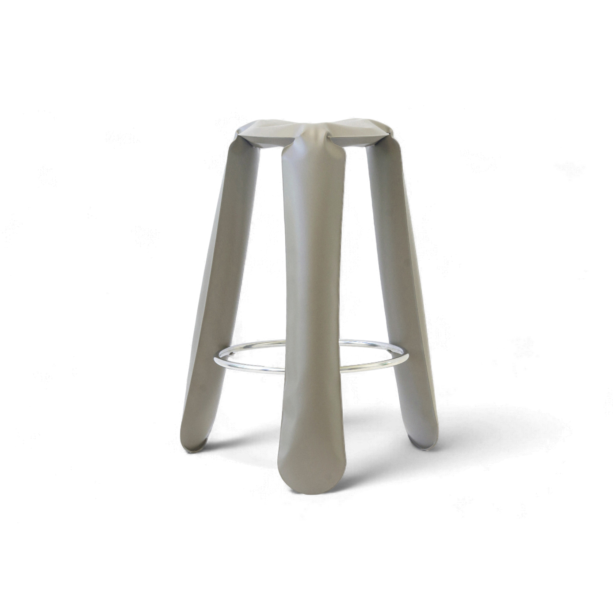 Bar height, three “inflated” legs-Looks crazy, sits rock steady. Plopp is designed by Oskar Zięta and made with FiDU: two super-thin steel sheets are welded, and then inflated by air to a certain volume. Each wrinkle is an original; no two stools crease alike.