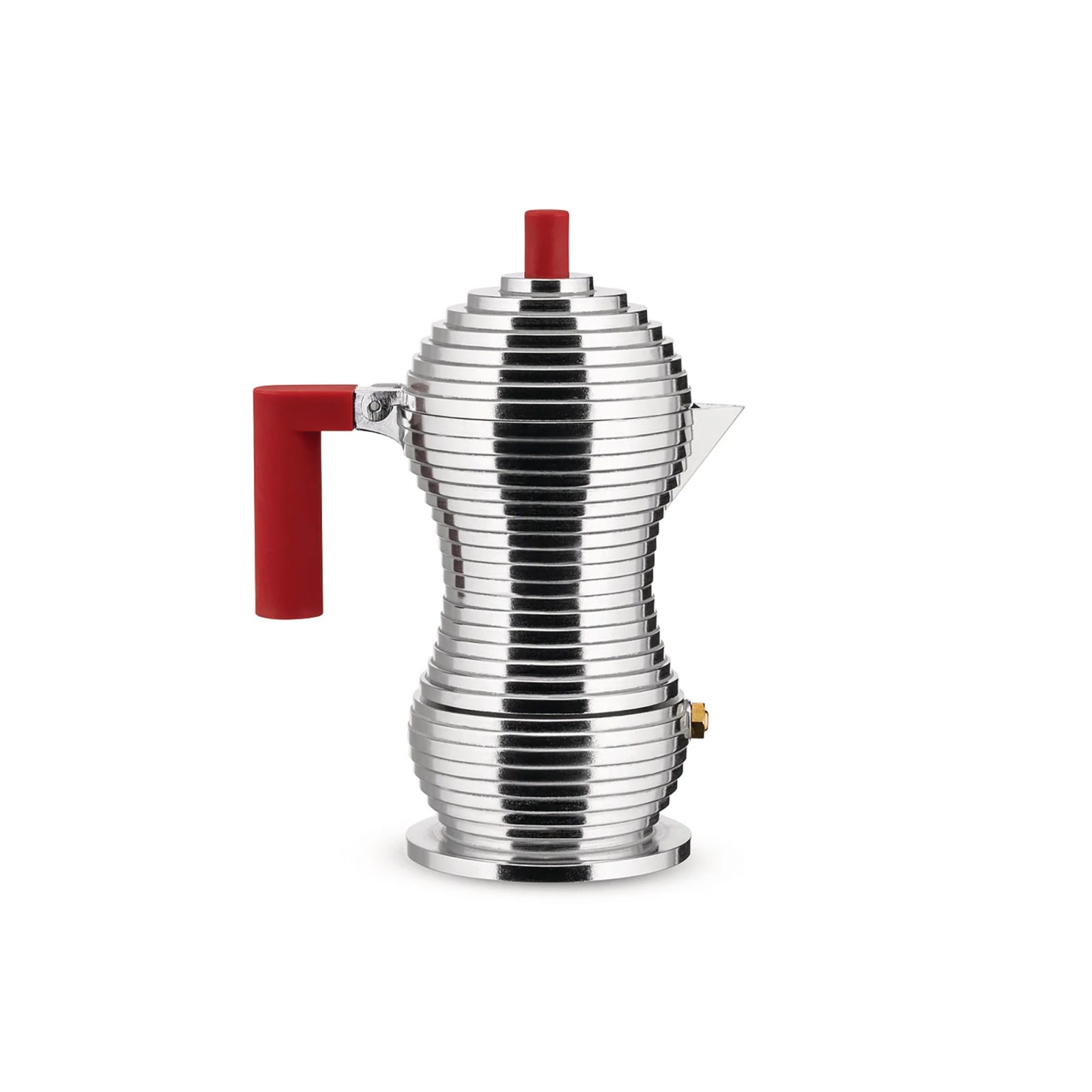 As a modern-day interpretation of the classic coffee pot, the Alessi Pulcina stands out not just for its innovative function but also its striking appearance. Offered with chic black or vibrant red handles, this espresso machine is more than a mere appliance; it’s a statement piece that brings together tradition and innovation, exemplifying Alessi’s commitment to both form and function.