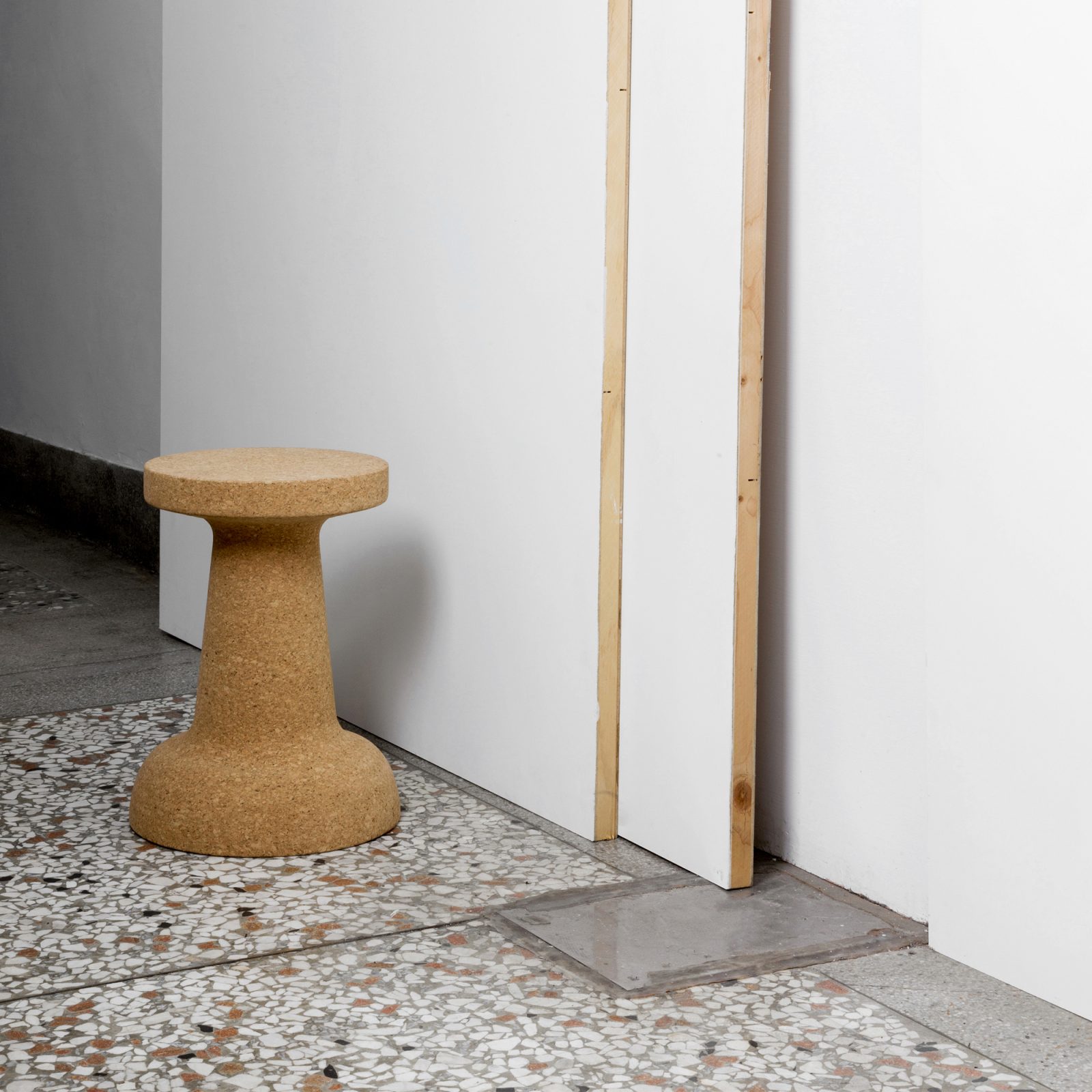 Inspired by office drawing pins shape, and blown the dimension up to create a playful interior element that’s flexible as it is fun. Notice the simple shape and explore the material at the same time. Characterised by an oversize familiar form and warm, natural cork, ‘Pushpin’ can be used both ways up; sit on the smaller surface or flip over to use as a coffee or side table. Pushpin is good to be a single side table beside a working desk, bedroom or sofa as well as practical to be a group of stools in a café, a restaurant garden, and other public spaces.